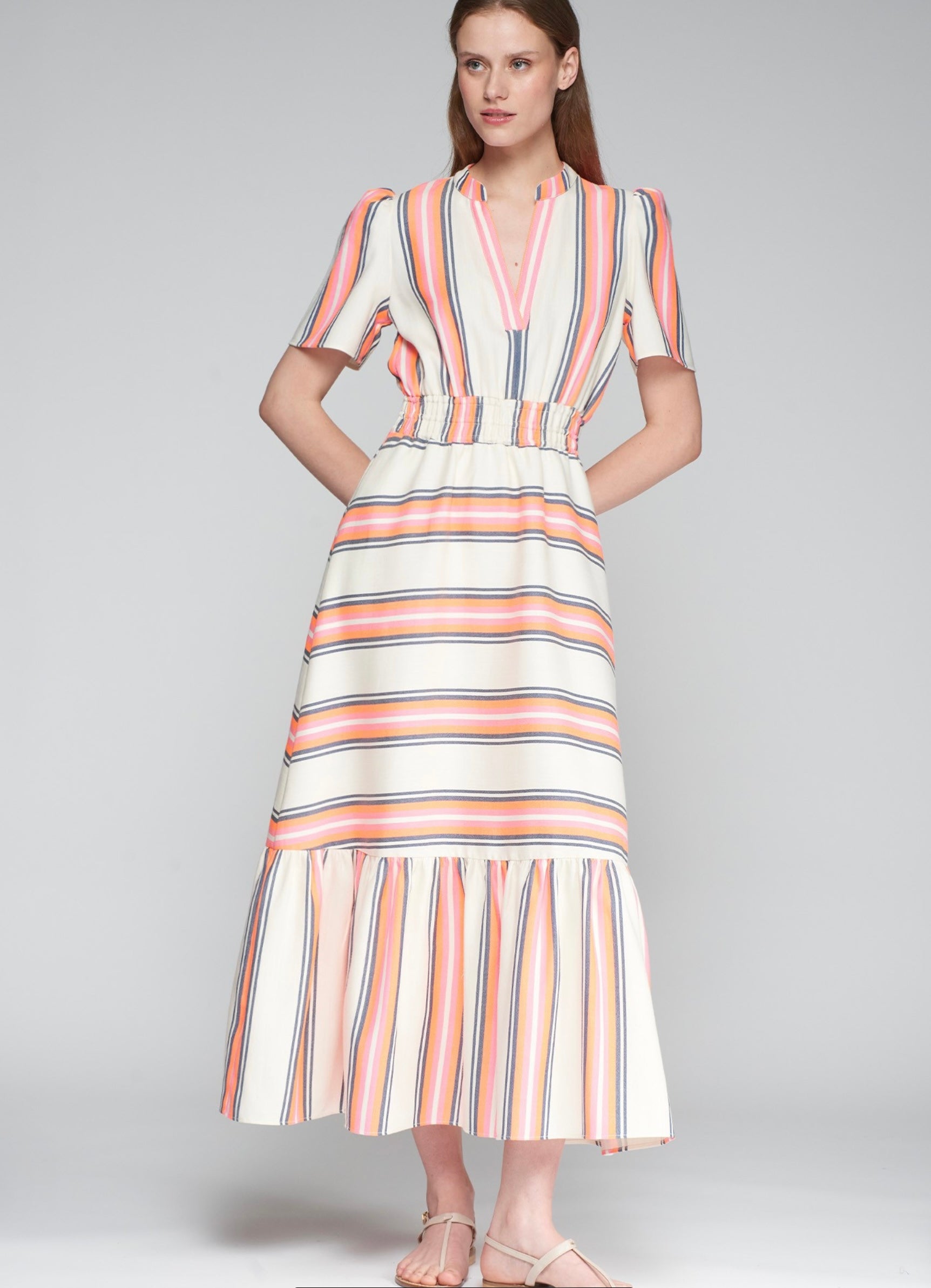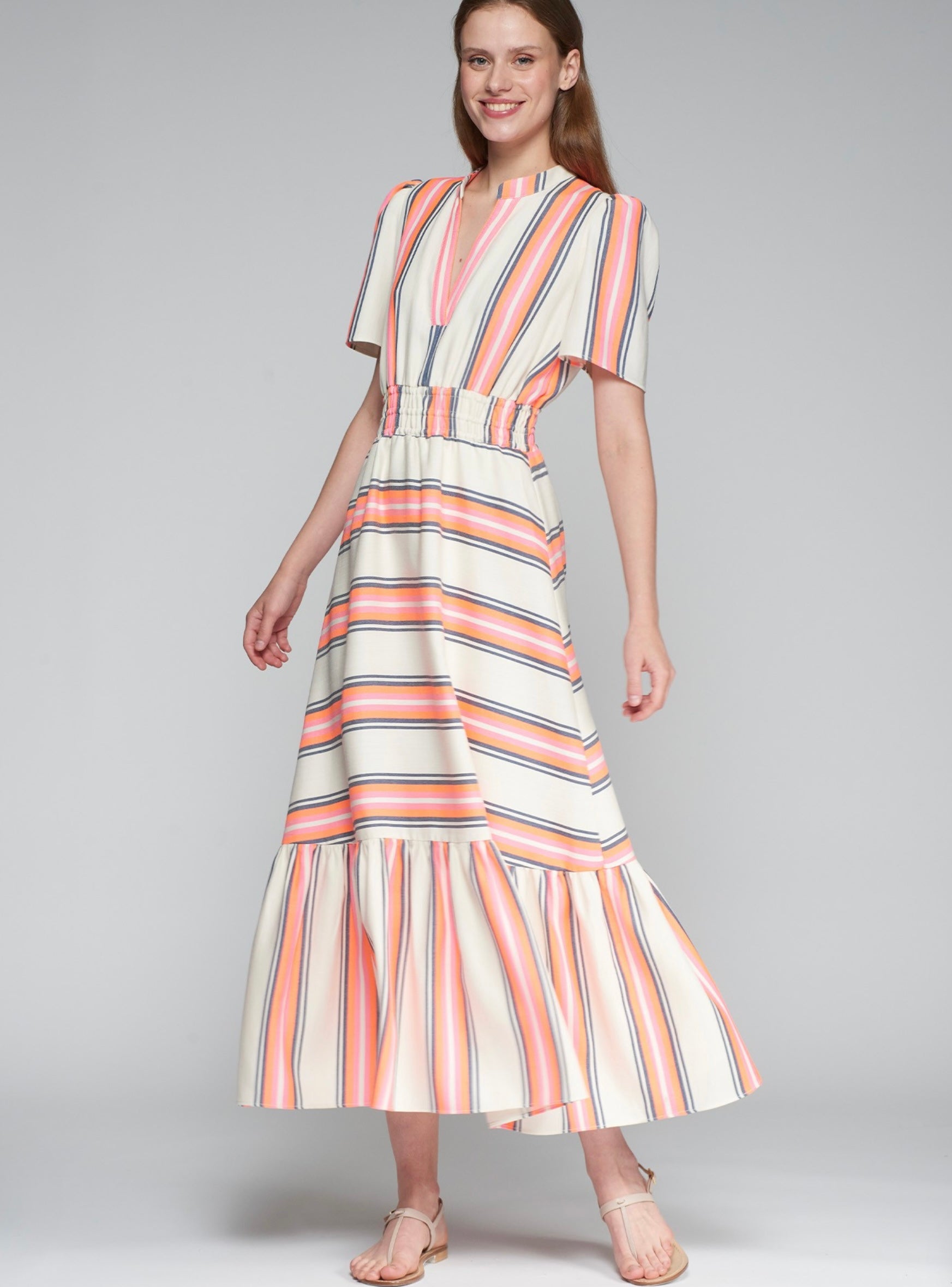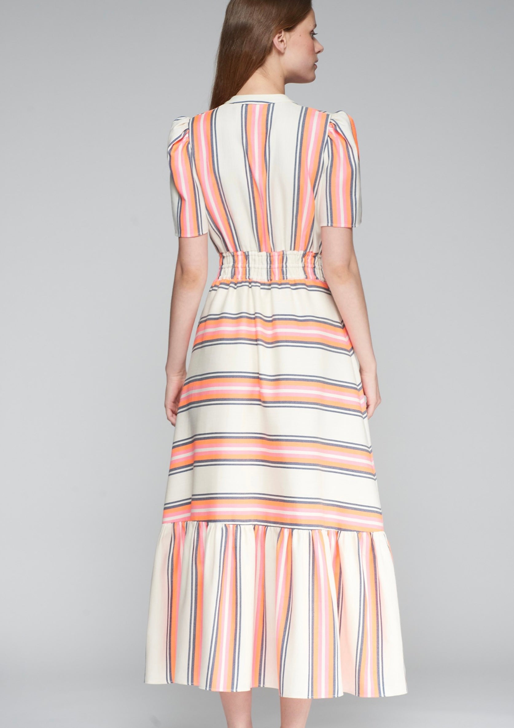 Dress with stripes in fluorescent and navy blue tones. Neckline with V opening. Elastic waist. Short puffed sleeves. The model is 1.79 and wears size 38.