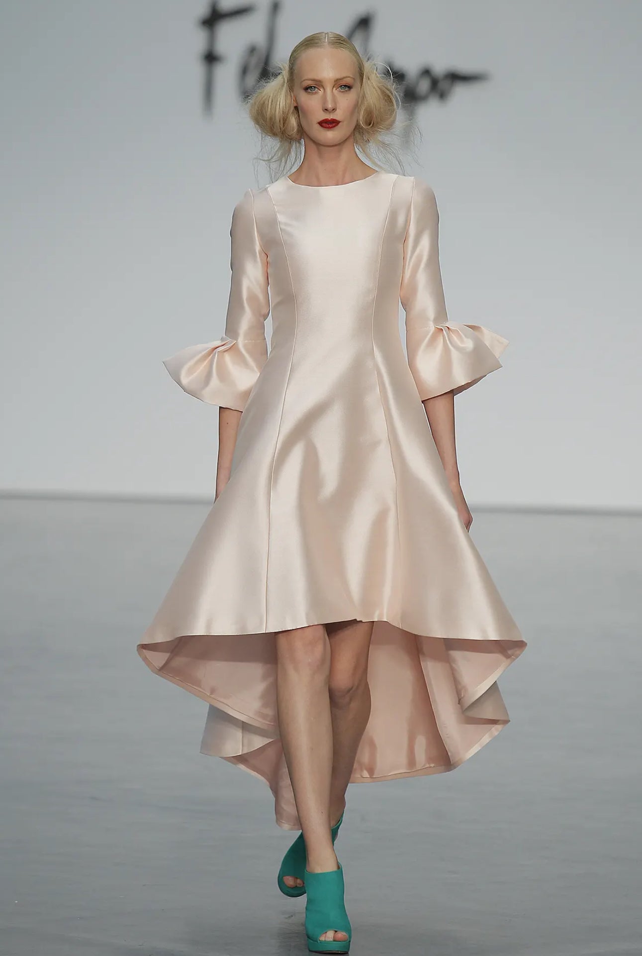 The image features a stunning Fely Campo Mother of the Bride/Groom dress in a soft, nude pink hue. The structured A-line silhouette beautifully flatters the figure, offering a sophisticated yet graceful look. The dress features a dipped hem, adding a modern touch to its classic design. The fabric is rich and luxurious, while the tailoring enhances the elegant shape. Note that the sizing runs small, ensuring a more fitted and refined look. Perfect for the discerning mother of the bride or groom, this dress exudes timeless elegance with a contemporary edge.