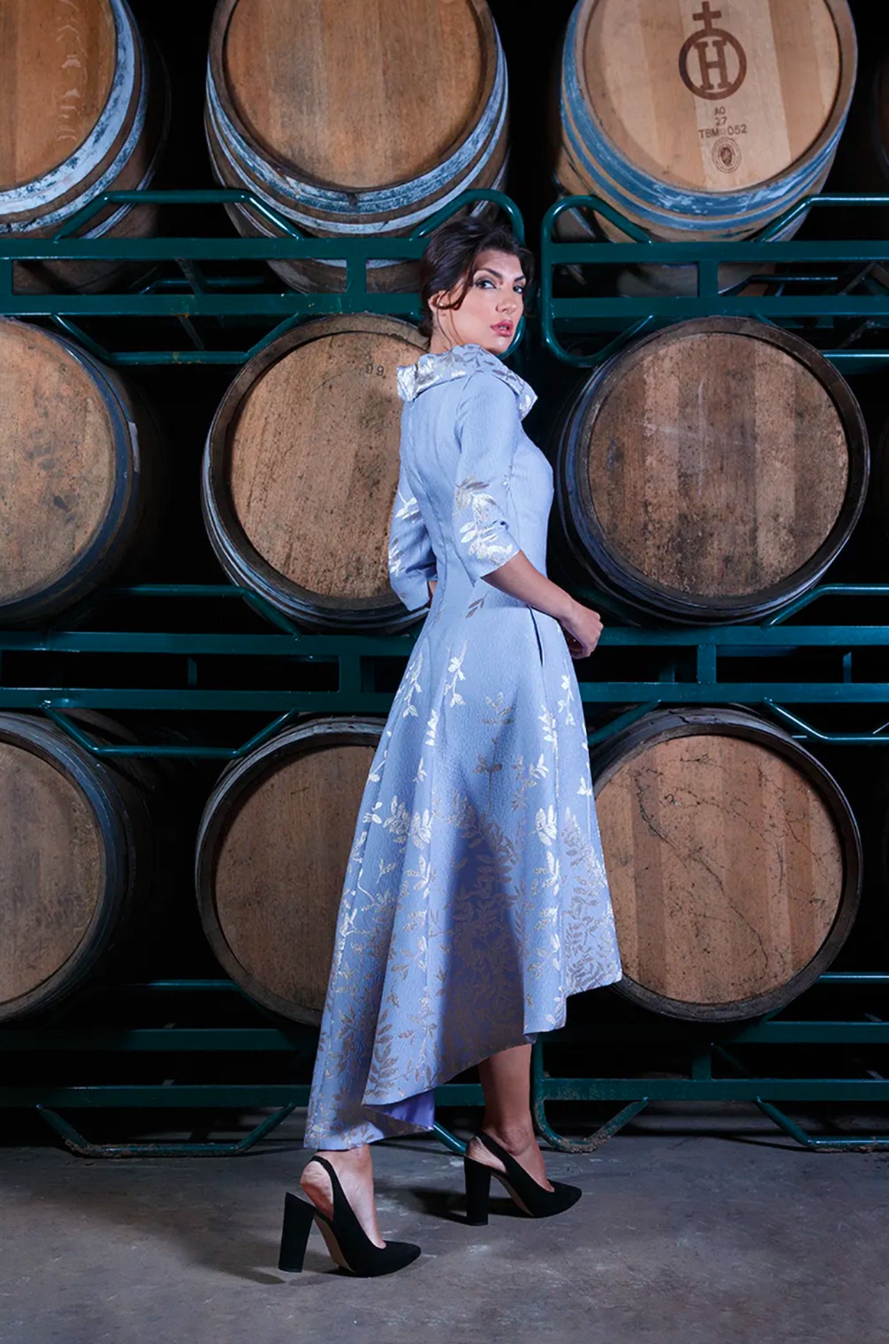 This exquisite Fely Campo Mother of the Bride/Groom dress features a soft lilac jacquard fabric, with delicate gold floral detailing woven throughout, creating a subtle yet luxurious shimmer. The A-line silhouette offers a flattering, graceful fit, while the dipped hem adds a modern, elegant touch to the classic shape. The intricate fabric and refined design combine to create a timeless, sophisticated look, perfect for a special occasion. Note that the sizing runs small, ensuring a more tailored and fitted appearance. This dress is an ideal choice for those looking to make a stunning, yet refined statement on the big day.