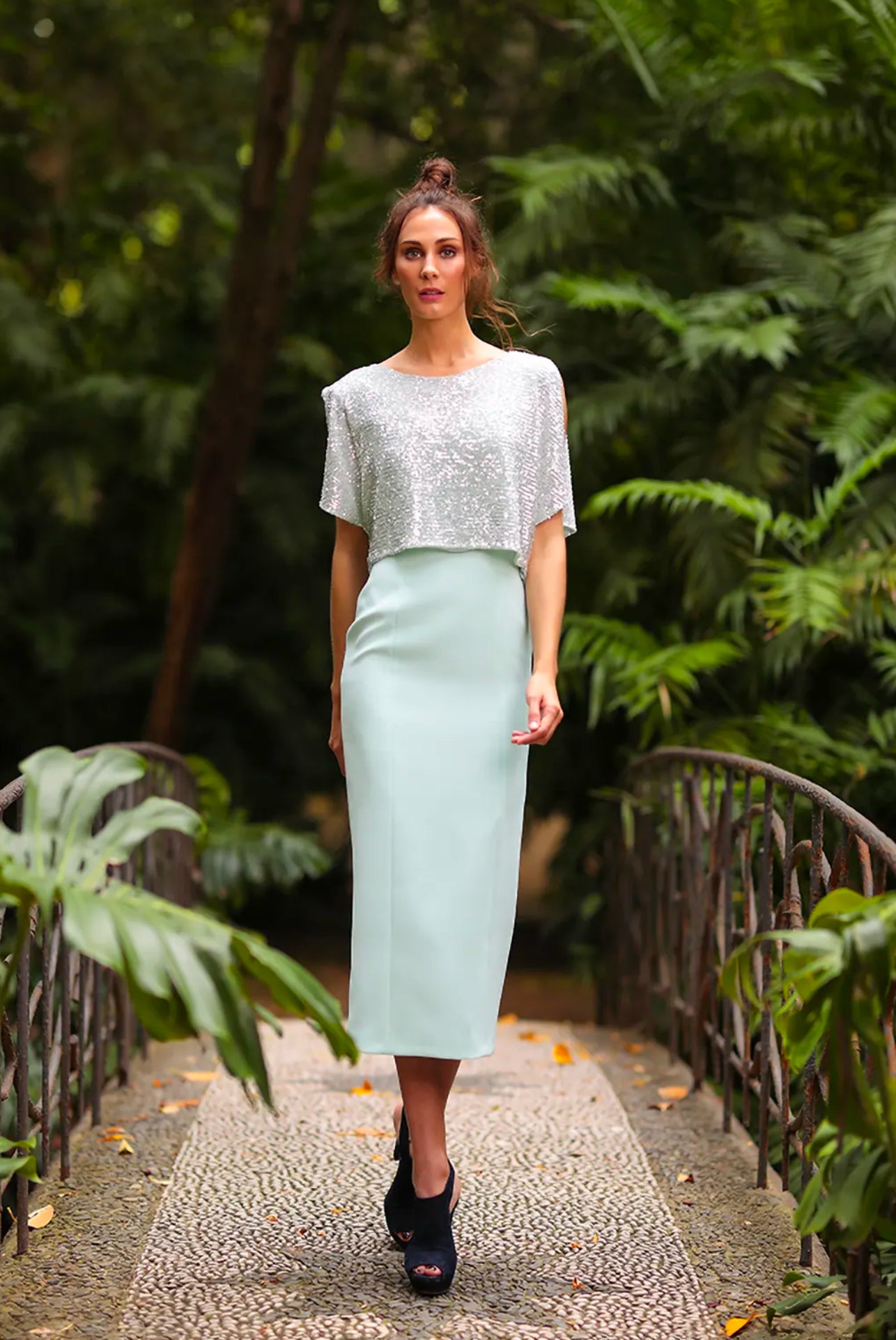 This Fely Campo Mother of the Bride/Groom dress is a showstopper in a refreshing aqua hue, with a flattering pencil silhouette that hits at the calf. The dress features a stunning silver sparkly overlay on the top, adding a touch of glamour and sophistication to the streamlined design. The combination of the sleek, fitted shape and the shimmering overlay creates a beautiful balance of modern elegance and festive allure. Crafted to perfection, this dress runs small, ensuring a more form-fitting and tailored look. Ideal for a mother seeking a chic, fashionable option for the celebration, with just the right amount of sparkle.