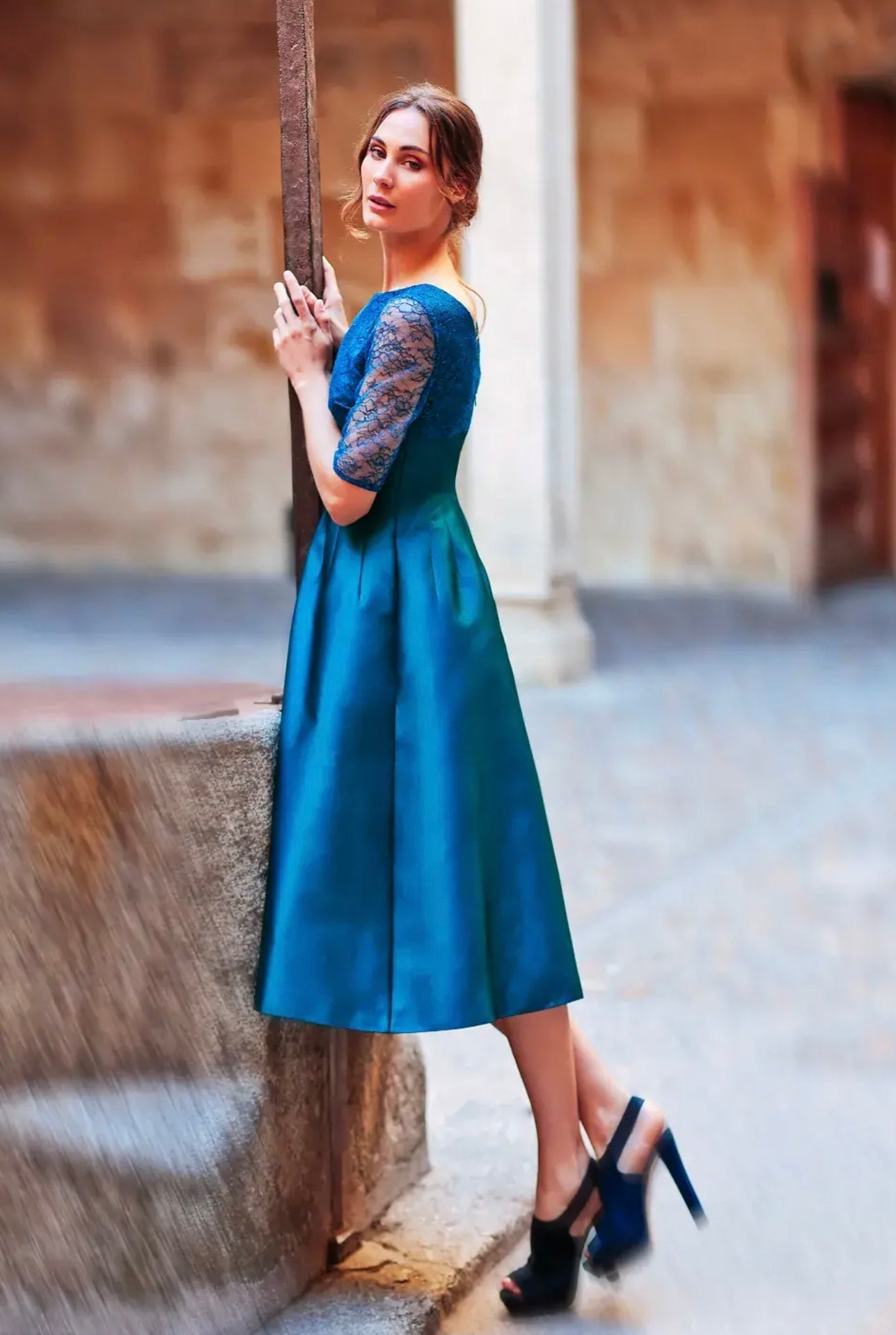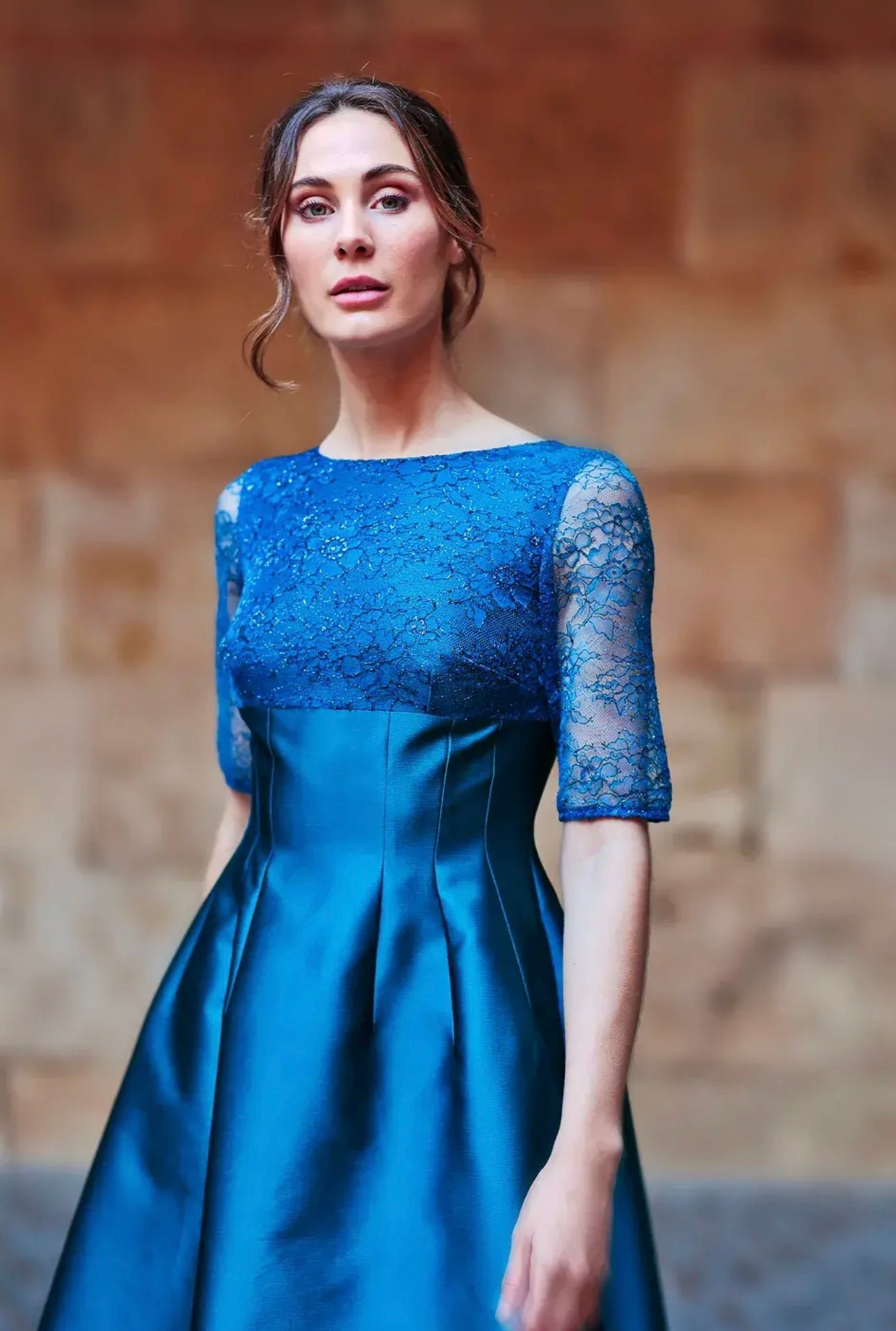 This Fely Campo Mother of the Bride/Groom dress is a stunning choice in deep teal, offering a rich, sophisticated hue. The sheer lace top overlay adds a delicate, romantic touch, with intricate lacework that beautifully contrasts the smooth, flowing fabric below. The dress features a flattering A-line shape with a dipped hem, creating a graceful silhouette that moves elegantly. Three-quarter length sleeves provide just the right amount of coverage, while the structured round neckline enhances the dress’s refined, tailored look. With a small fit, this dress hugs the figure for a sleek and polished appearance, making it an ideal choice for the mother seeking a blend of timeless elegance and modern sophistication.