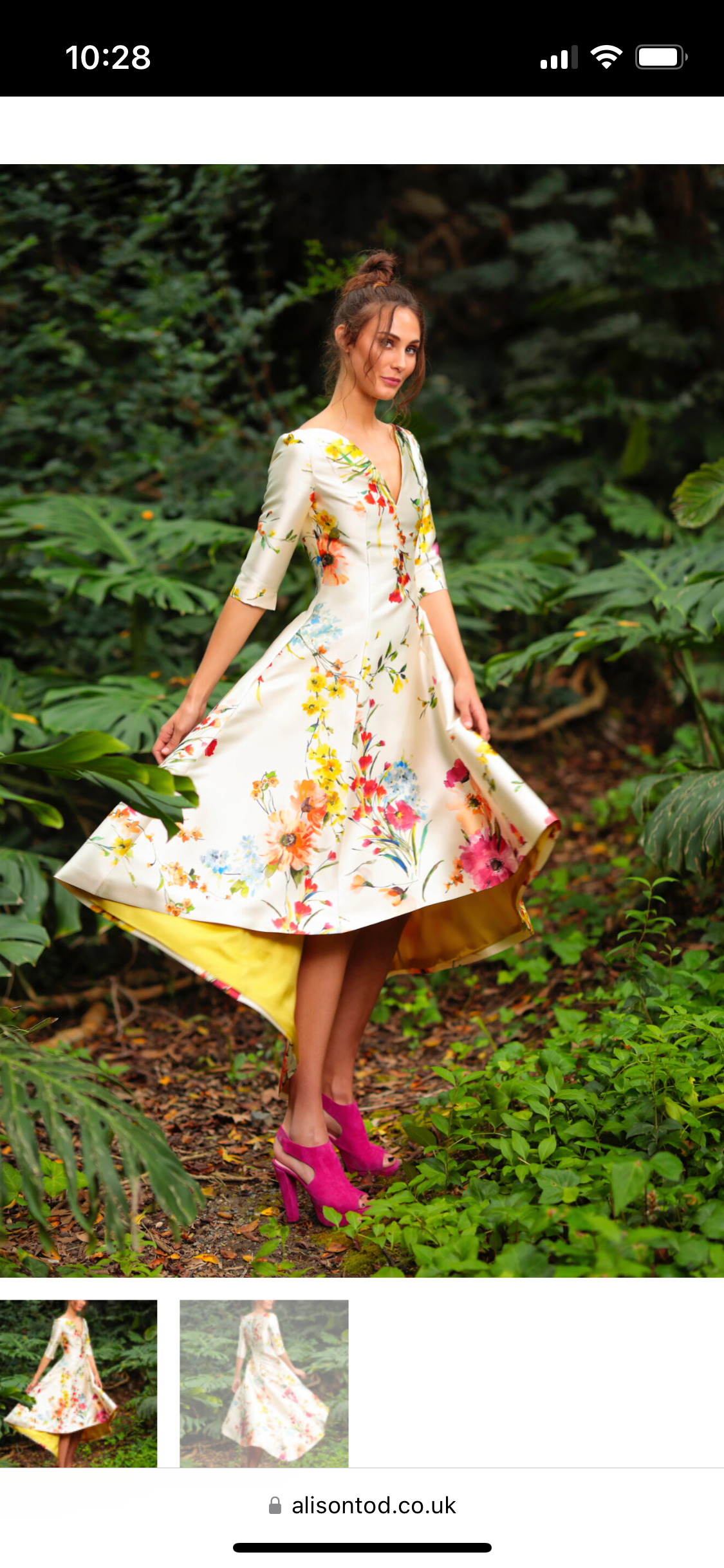 This Fely Campo Mother of the Bride/Groom dress is a vibrant, eye-catching choice, perfect for a summer wedding. The cream base serves as a soft, elegant backdrop to the bright watercolor-style floral pattern, featuring bold reds, oranges, pinks, and greens that bring the design to life. The dress is available in two stunning styles: a flattering A-line shape with a dipped hem for a more relaxed, flowing silhouette, or a sleek, fitted pencil style for a tailored, contemporary look. With its lively colors and floral design, this dress combines modern elegance with a playful, summery vibe. The brand runs small, ensuring a more fitted, refined appearance that is ideal for a chic and fashionable mother of the bride or groom.