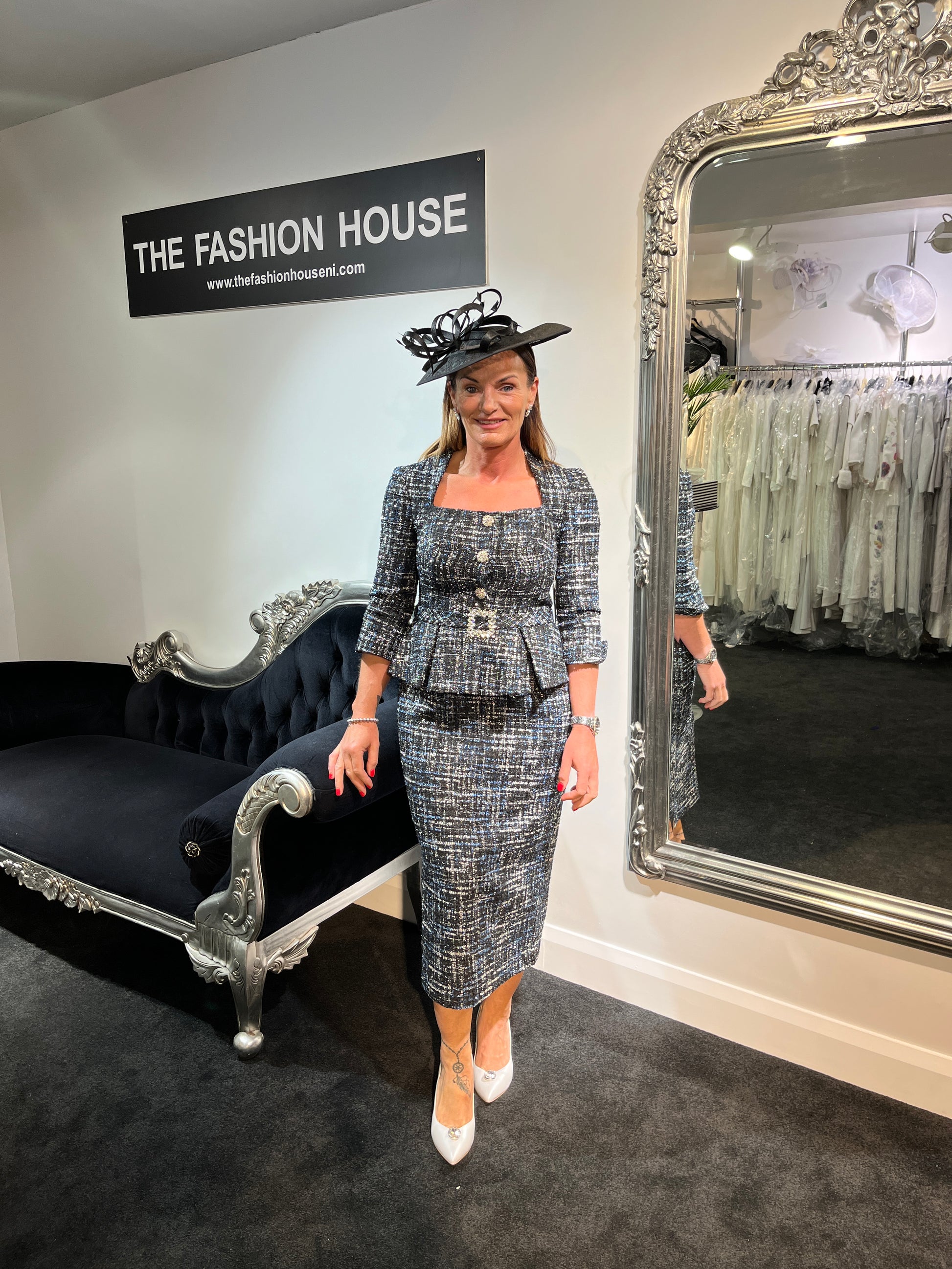 This Irresistible Mother of the Bride/Groom dress exudes sophistication and modern elegance. Crafted from a luxurious tweed fabric, it features a captivating mix of silver, light blue, and black threads woven throughout, creating a unique and chic pattern that is both striking and subtle. The fitted pencil shape hugs the body to create a sleek, flattering silhouette, while the long sleeves add an extra touch of refinement. The structured neckline provides a bold and tailored look, complementing the dress’s overall sleek design. Ideal for a winter formal event, this dress offers a perfect balance of classic elegance and contemporary style, making it a standout choice for any mother of the bride or groom.