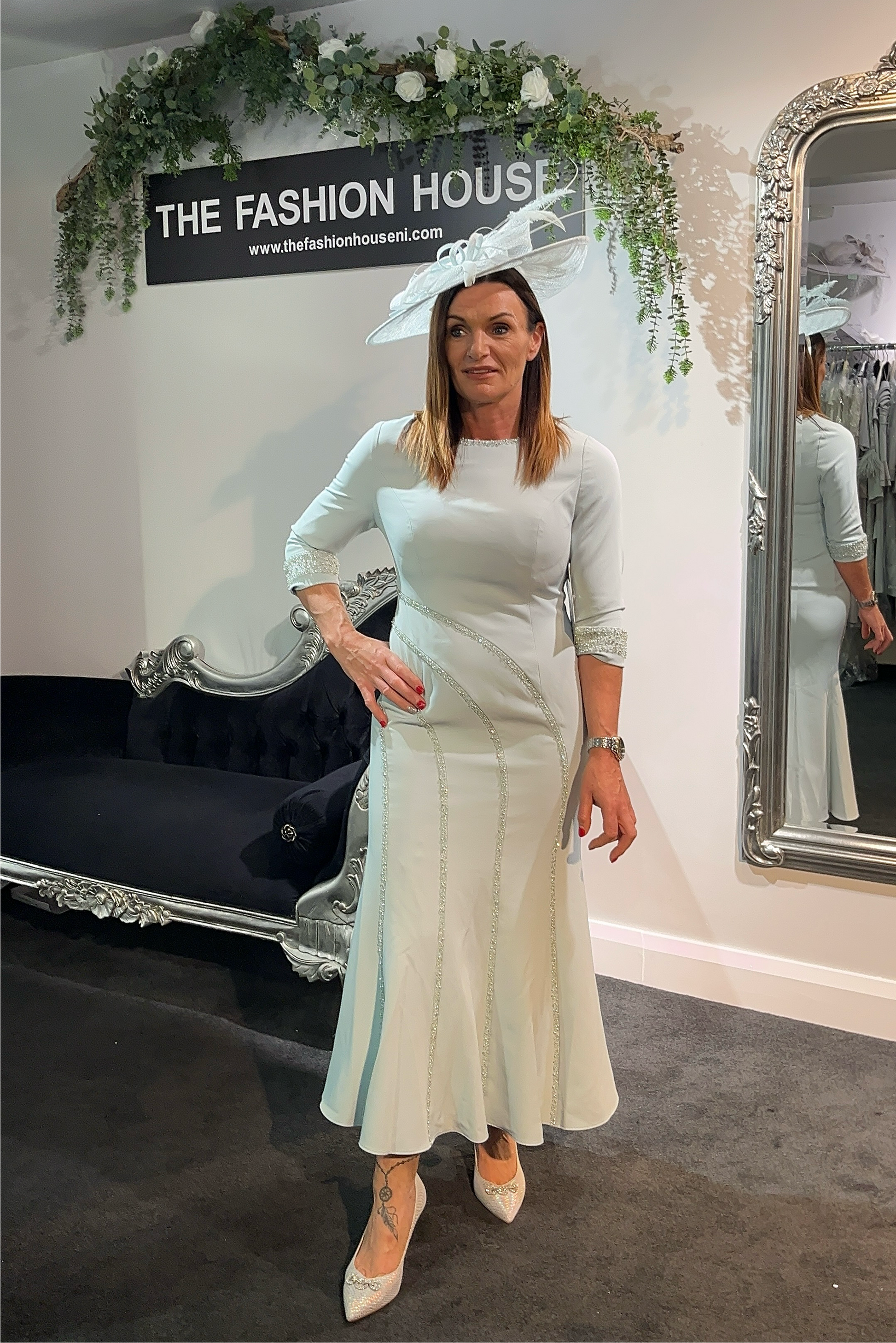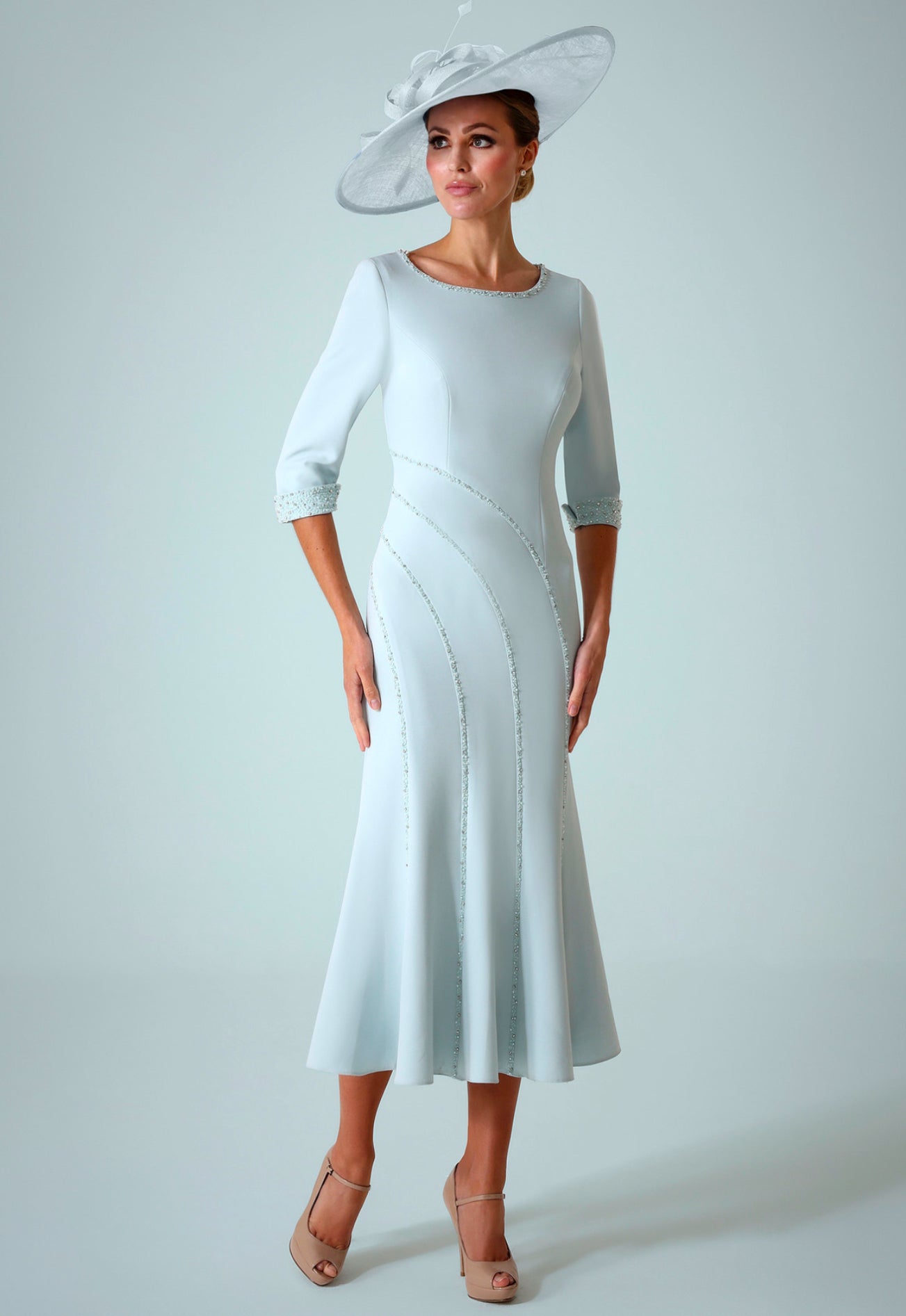 This Irresistible Mother of the Bride/Groom dress in pale aqua teal is a stunning choice, offering a delicate yet sophisticated look. The fitted silhouette hugs the body gracefully, accentuating the figure before flowing out into a dramatic fishtail hem, adding movement and elegance. The soft round neckline offers a timeless, refined finish, while the sparkling embroidered detailing along the neckline and bodice adds a touch of glamour and texture, catching the light beautifully. The pale aqua teal color provides a fresh, ethereal quality, making it perfect for a spring or summer wedding. This dress combines subtle shine, luxurious fabric, and an elegant silhouette, ensuring the mother of the bride or groom feels radiant on such a special occasion.