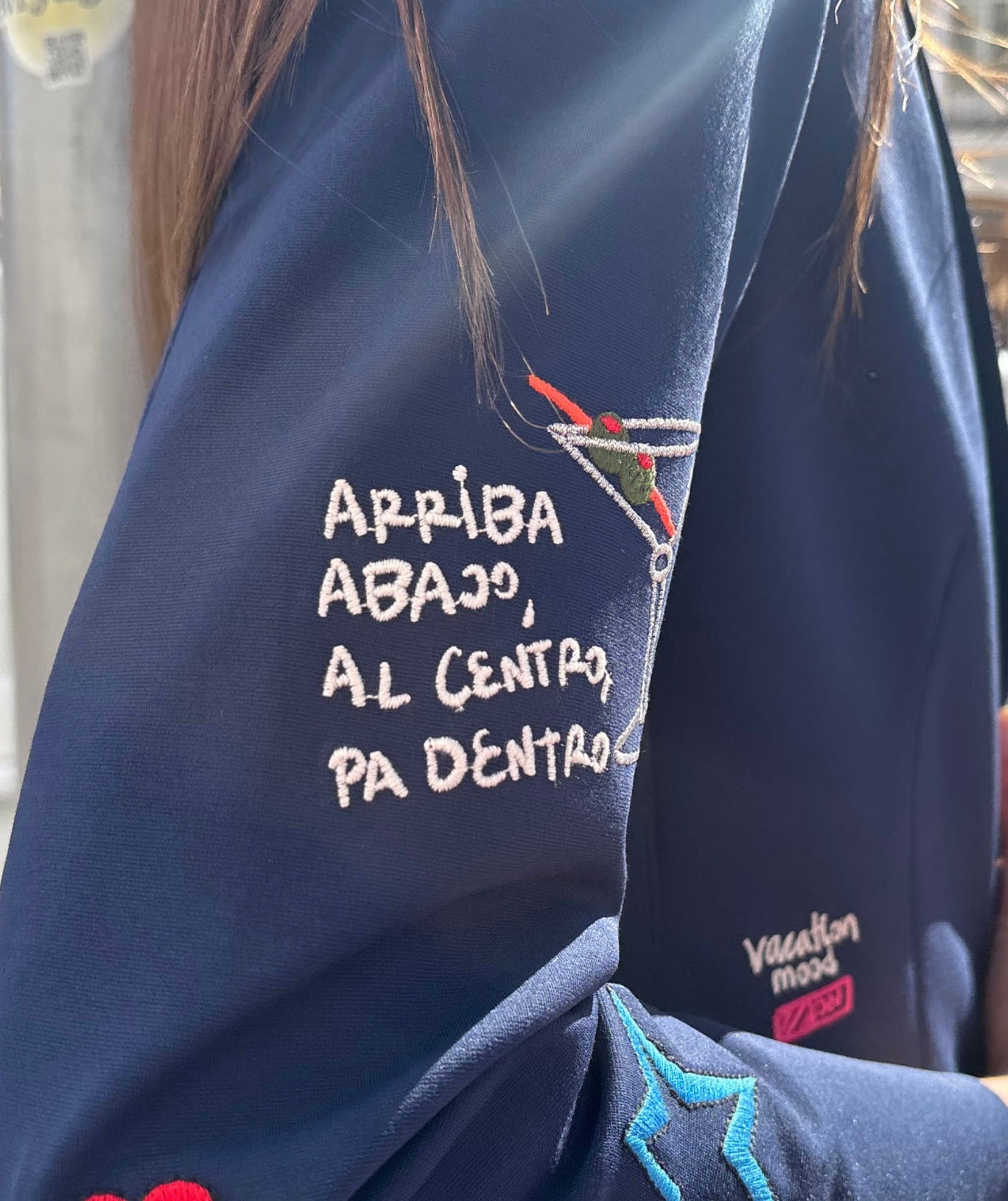 Navy blue blazer with exclusive Vilagallo snacks embroidery. Front fastening with decorative button with pineapple. Flap pockets. Matching trousers available. The model is 1.75 m tall and wears size 38