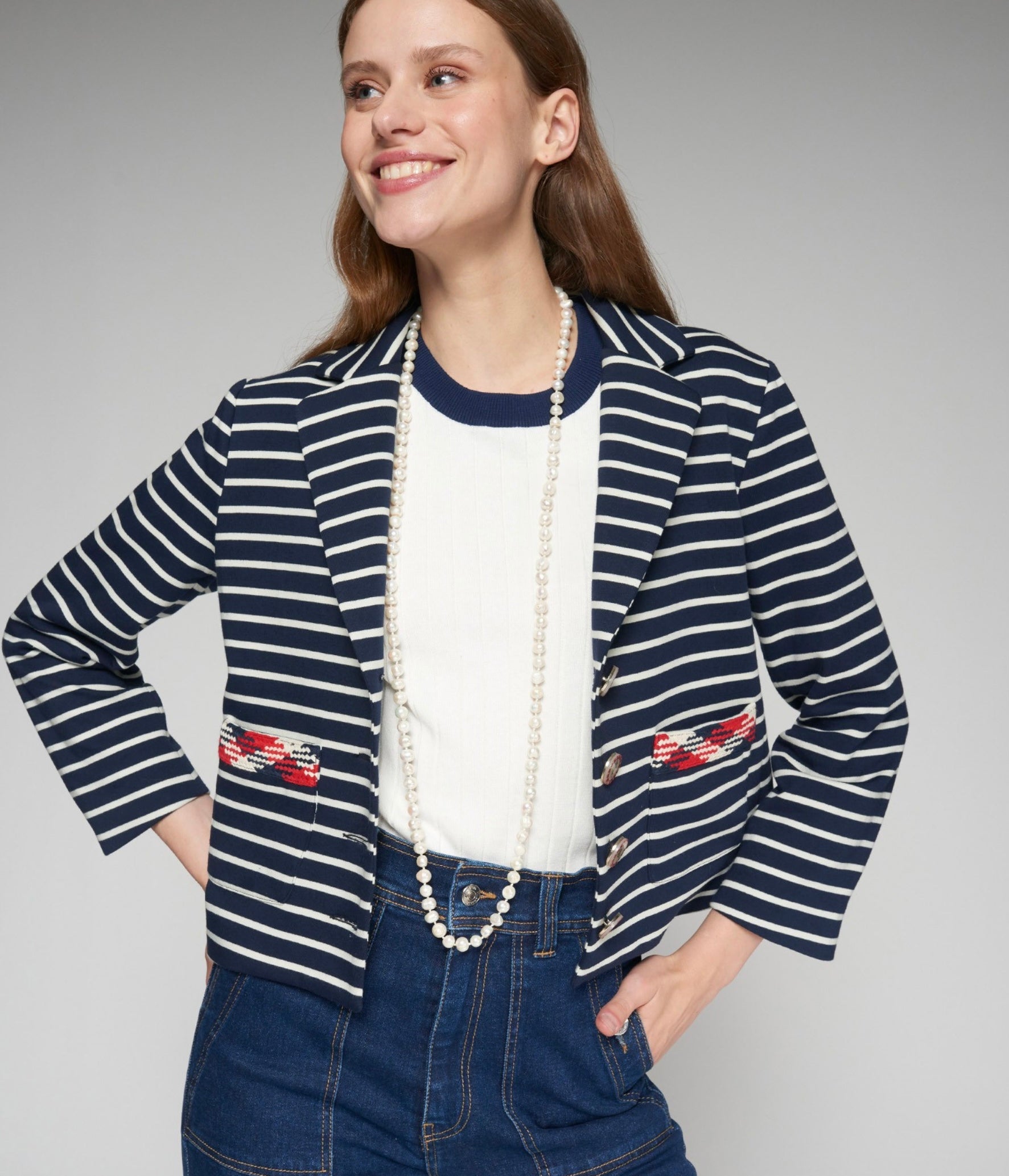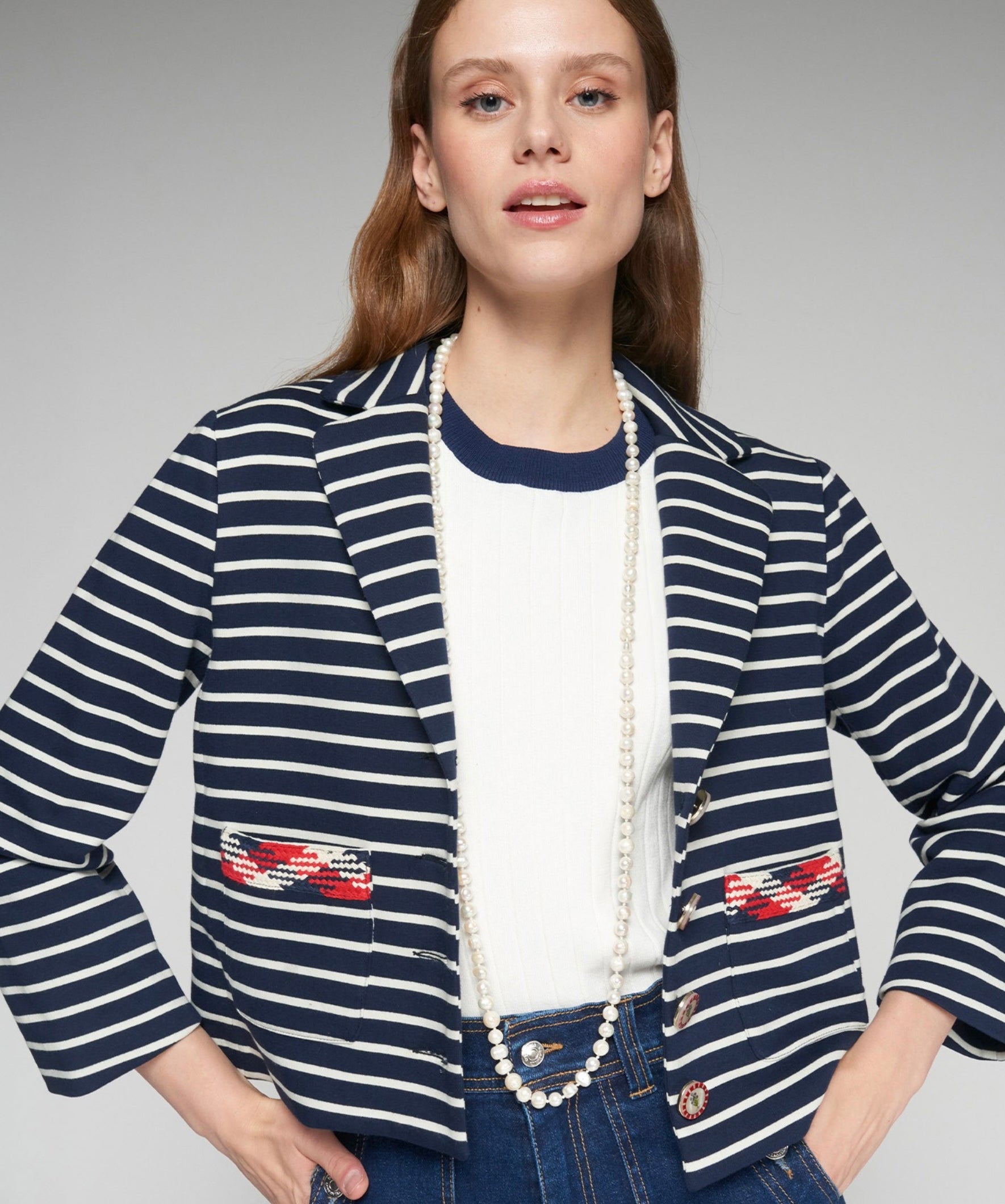 Short jacket with navy blue and white horizontal stripes. Pockets with red and blue embroidery. Front fastening with decorative flower buttons. Exclusive Vilagallo printed lining. Matching trousersavailable. Model is 1,79 tall and wears size 38.
