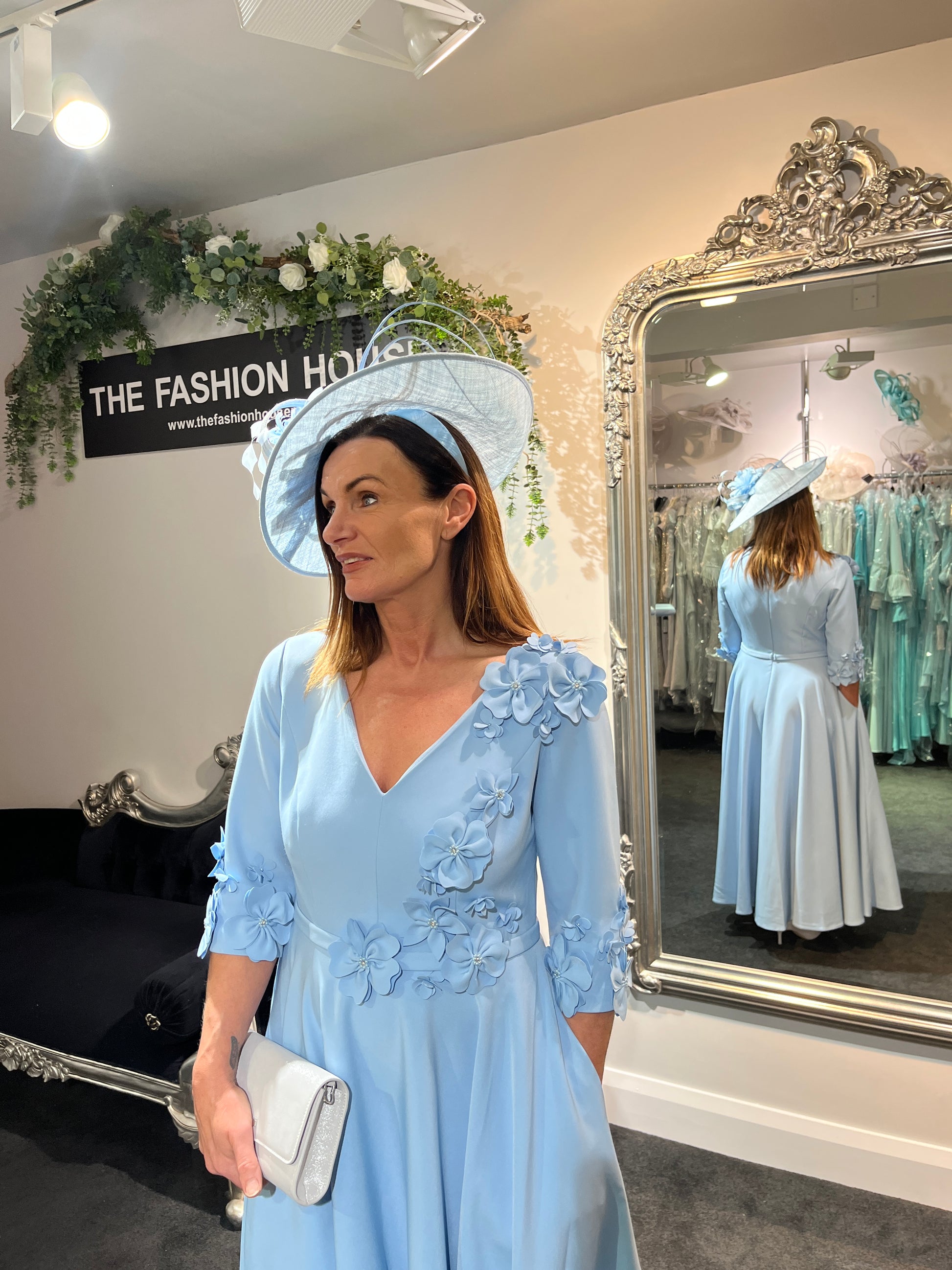 This elegantly crafted V-neck A-line crepe dress features exquisite 3D floral cut work that runs down the bodice and cuffs, adding a delicate and sophisticated touch. The ¾ sleeves perfectly complement this classic style, making it ideal for any special occasion. With its timeless design and intricate details, this dress is sure to make you feel confident and beautifully poised.