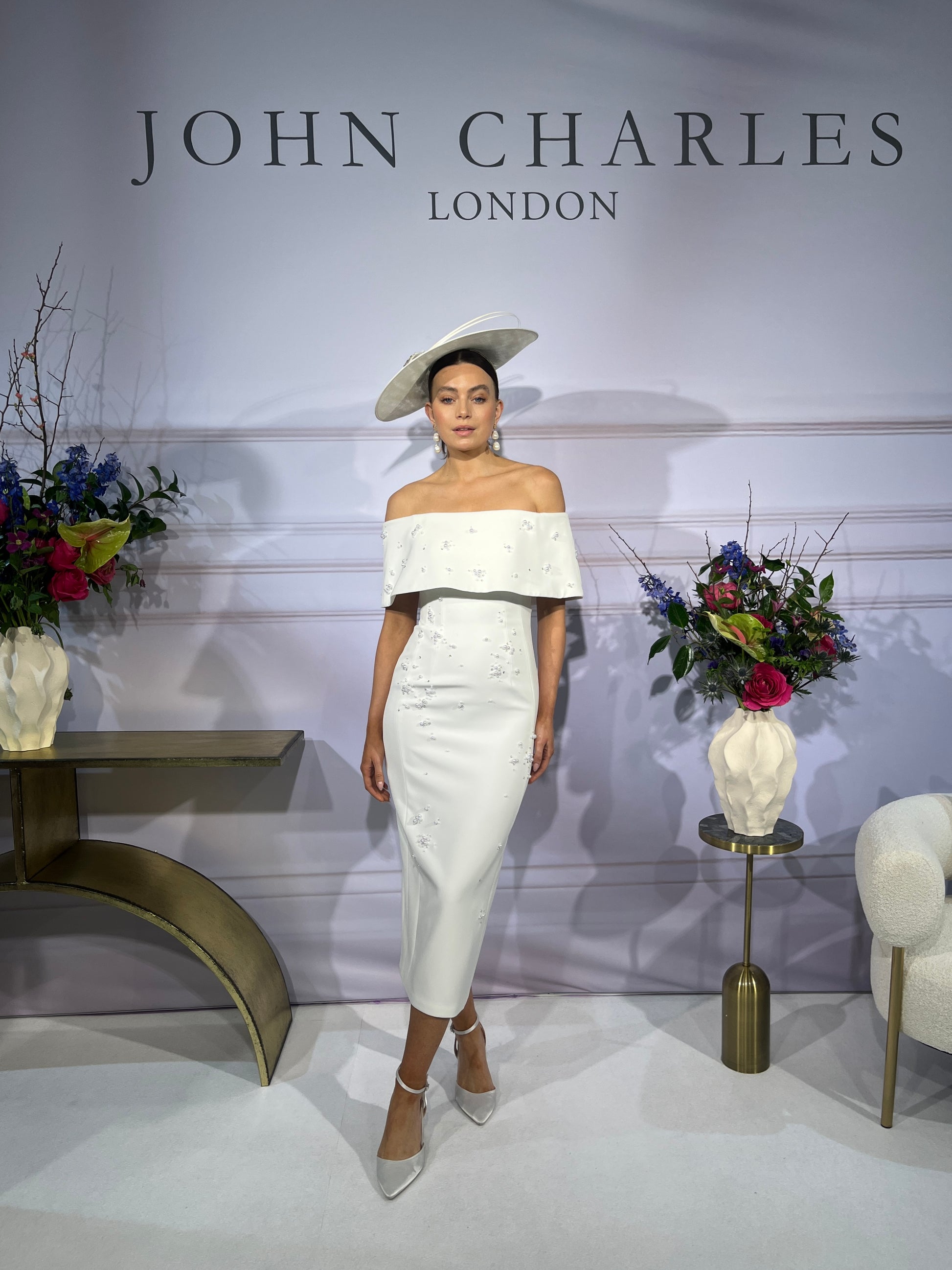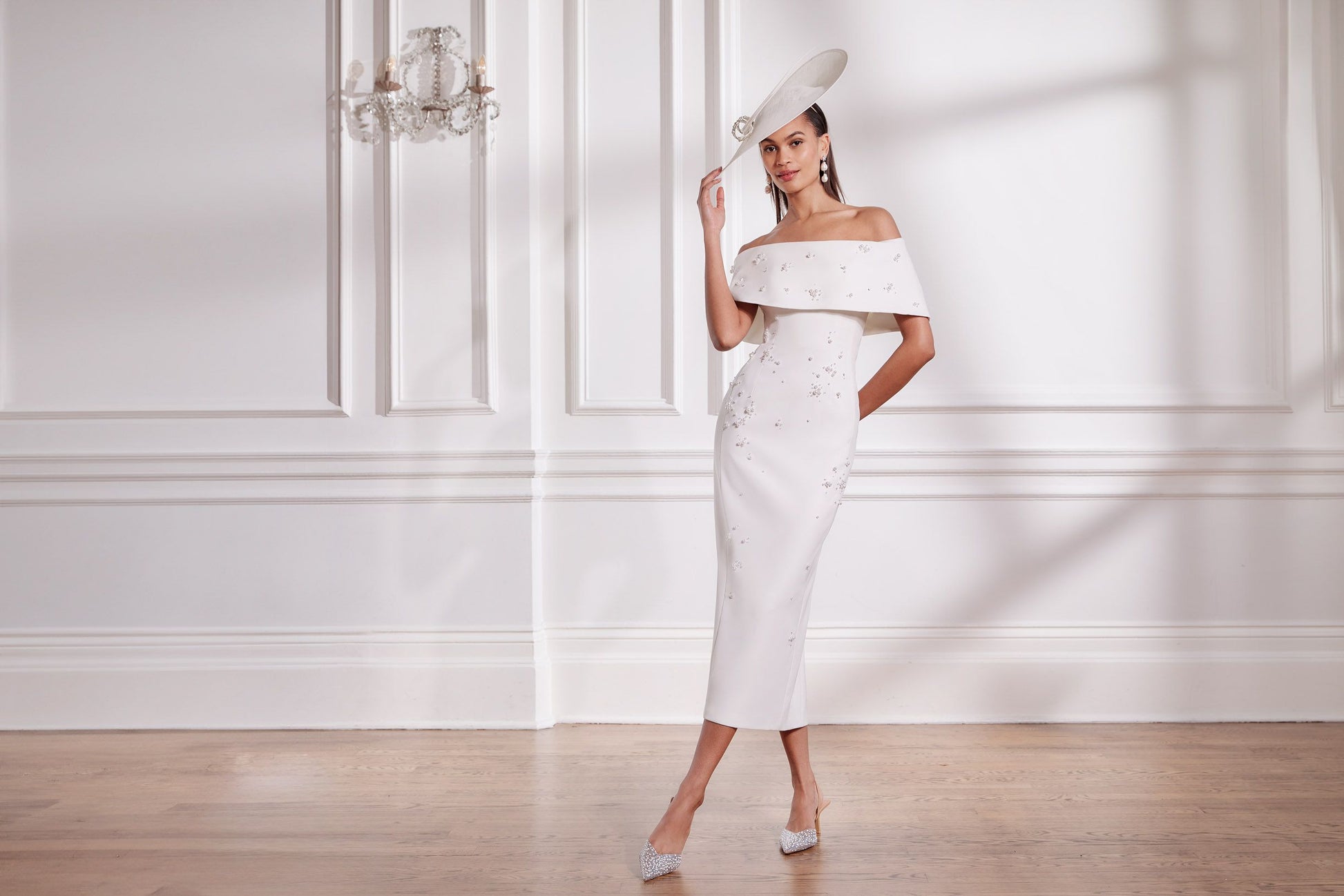Fitted midi dress with perl beading and optional additional shoulder coverage