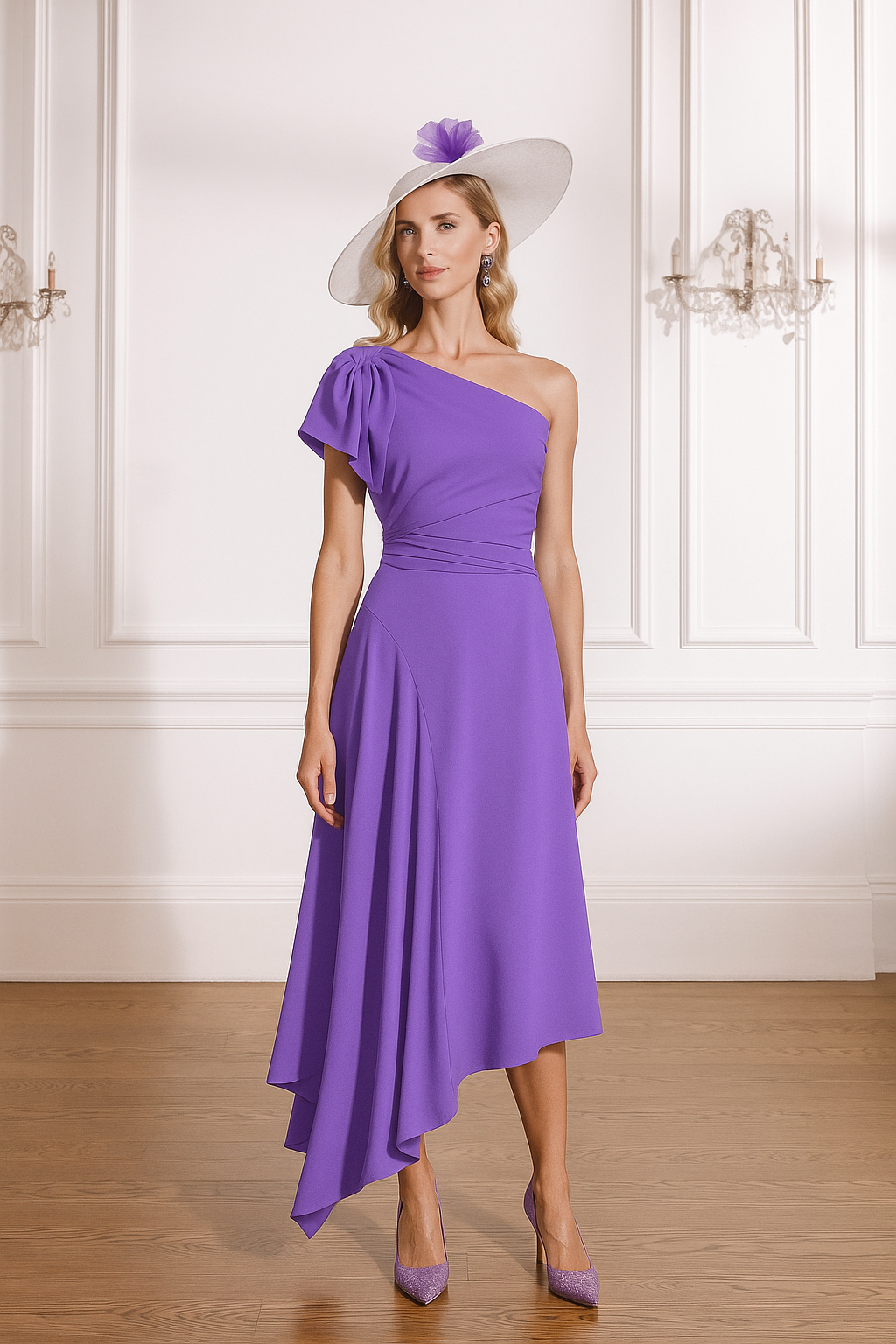 Elegant crepe dress featuring an asymmetric hem. The fabric drapes across the bodice, creating a twisted flower detail at the shoulder. Designed with an asymmetric flutter sleeve and a plissé panel on the skirt for added texture and movement.