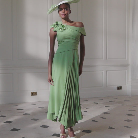 John Charles crepe & cut work asymmetrical A-line midi with pleats