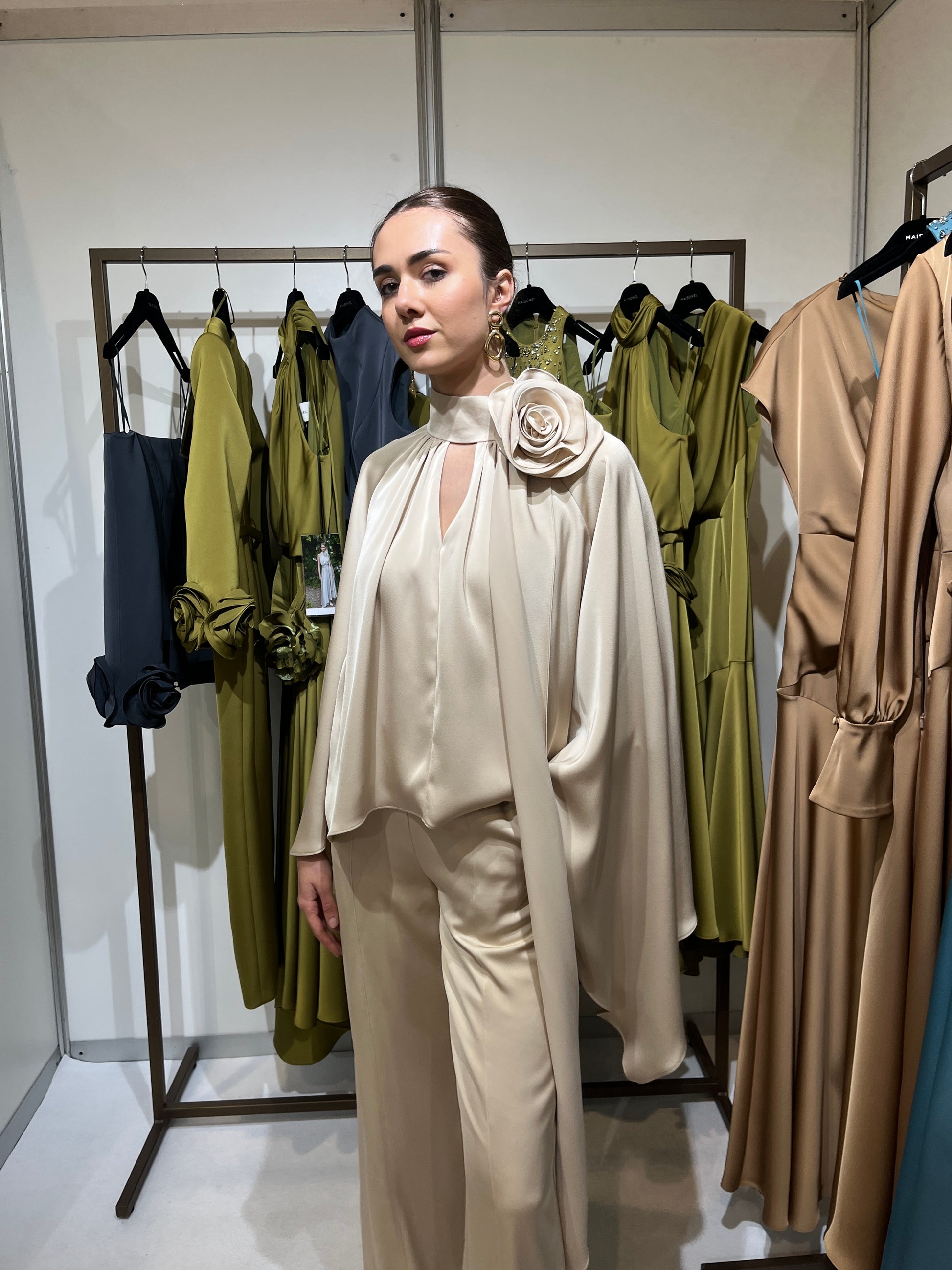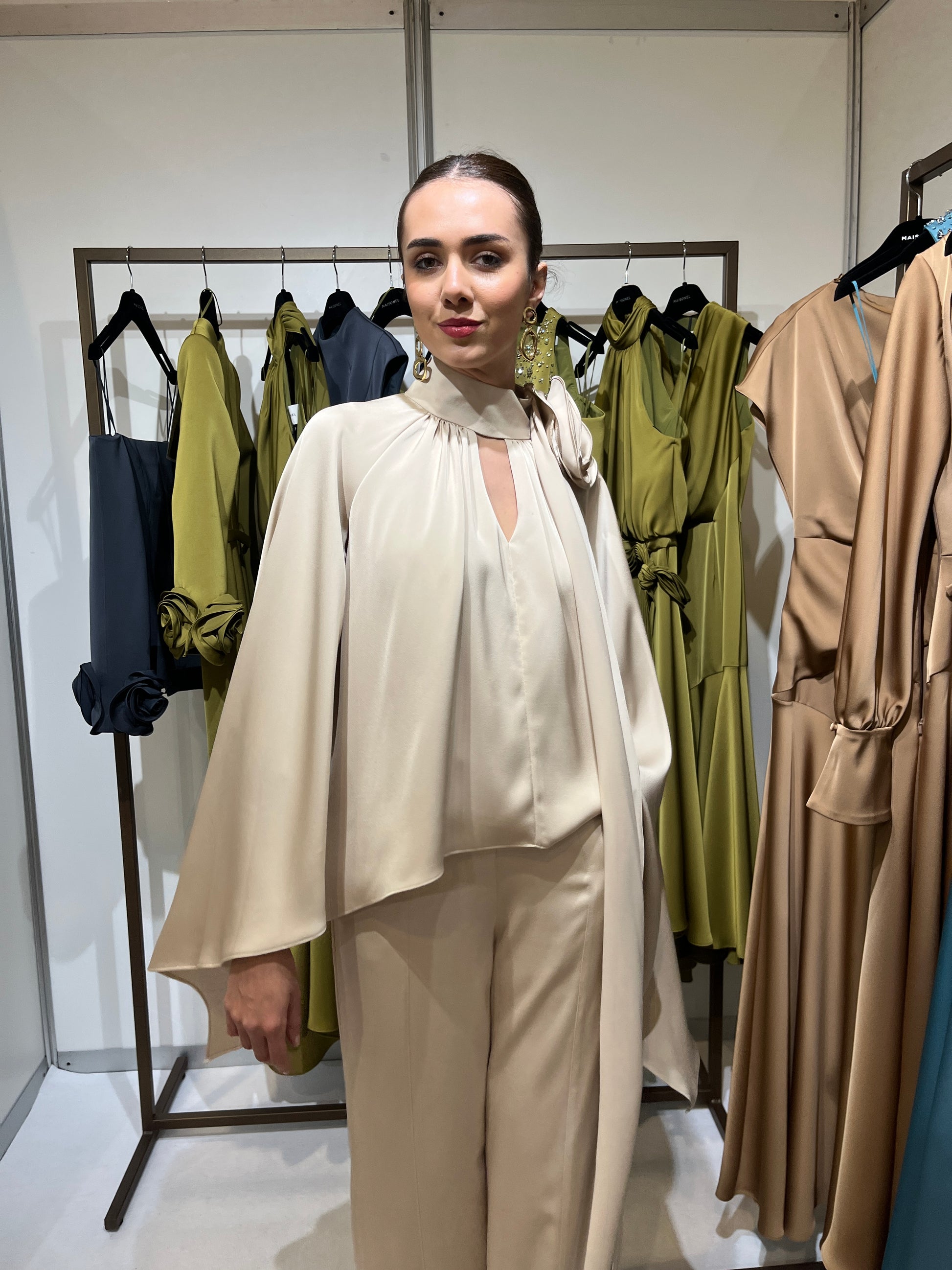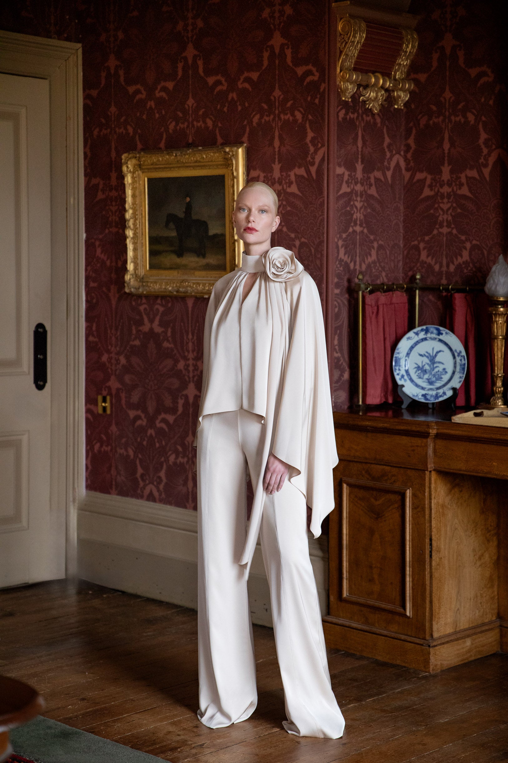 This top and trouser set features sleek, wide-leg tailored trousers, paired with lightweight satin draped blouse.