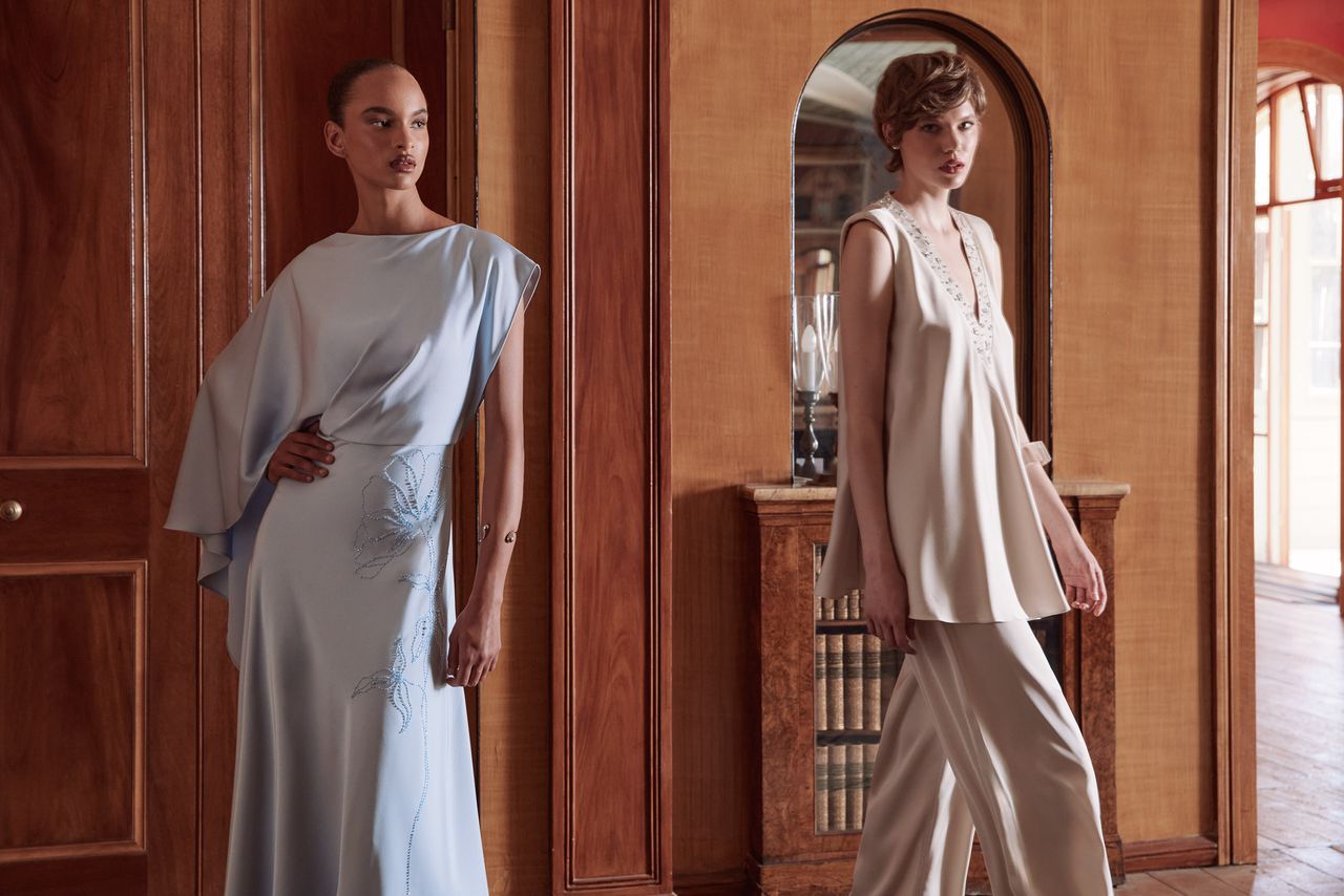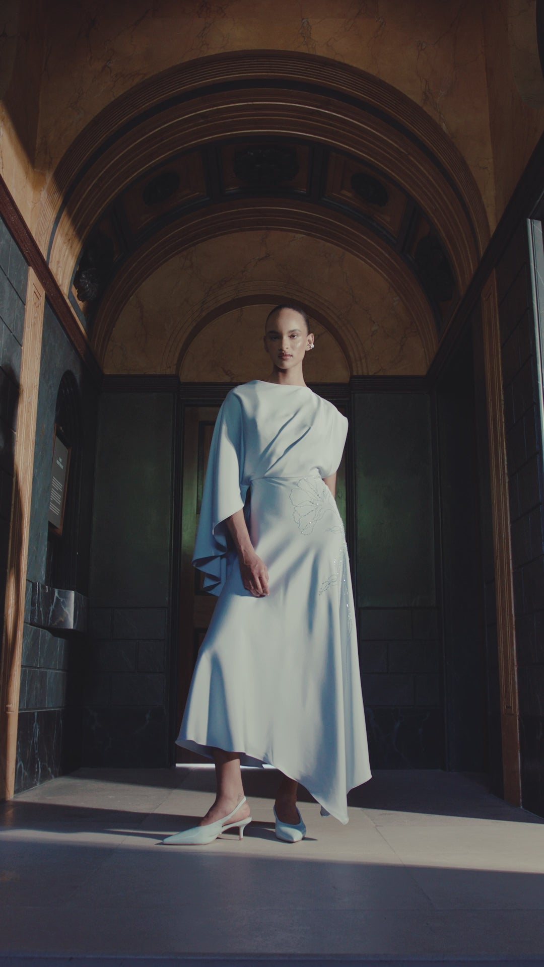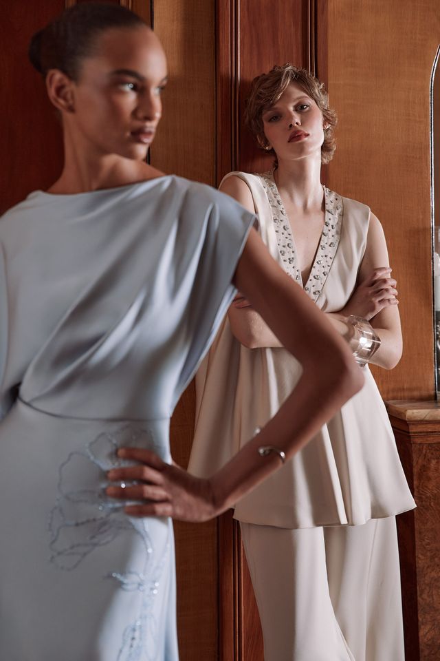 A-line mother of the bride/groom dress in crepe with asymmetric cape