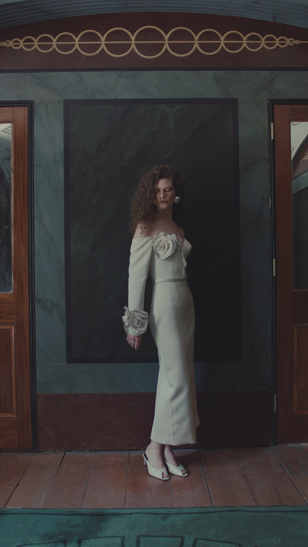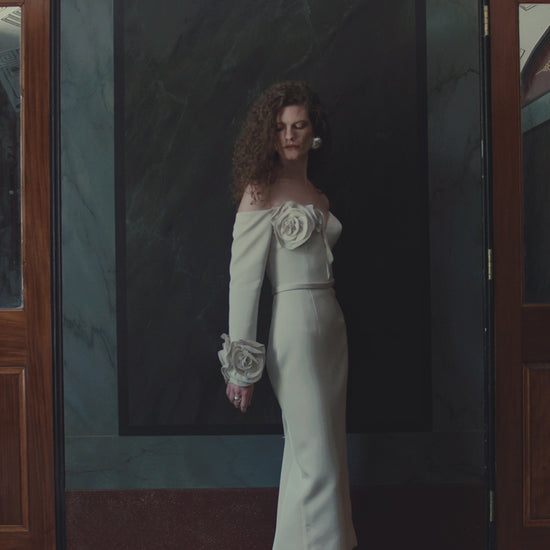 Mother of the bride/groom dress in crepe with off-shoulder neckline and straight midi skirt