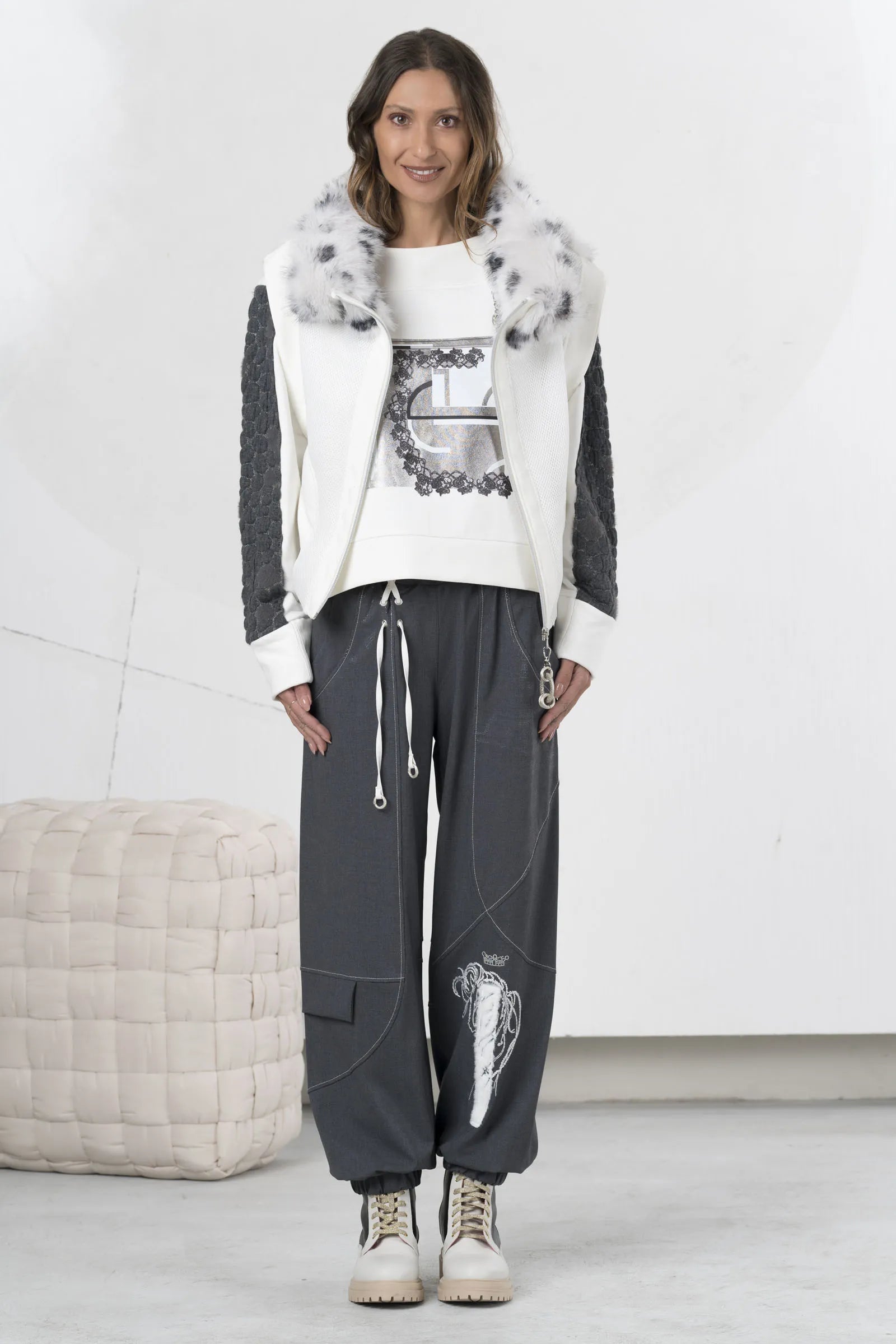 White sleeveless padded vest. White and charcoal spotted faux fur back and collar. Contoured pockets on hips. Comfortable vest for sportychic look.