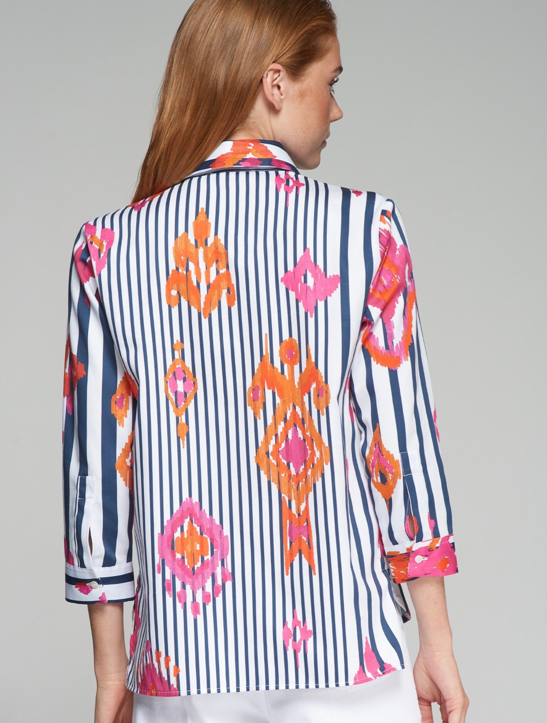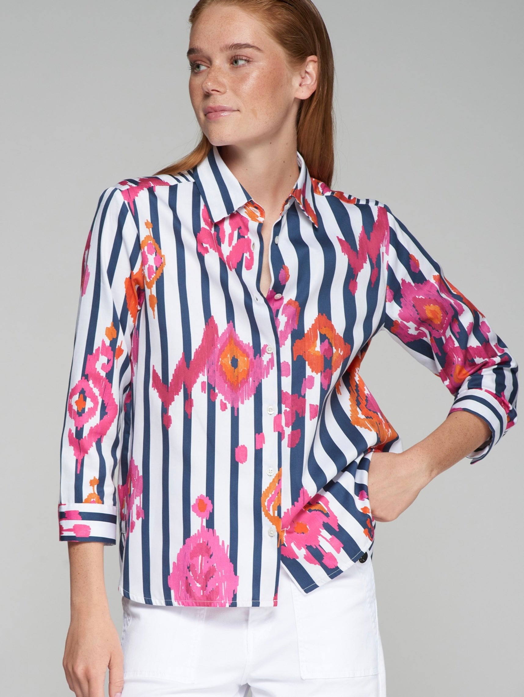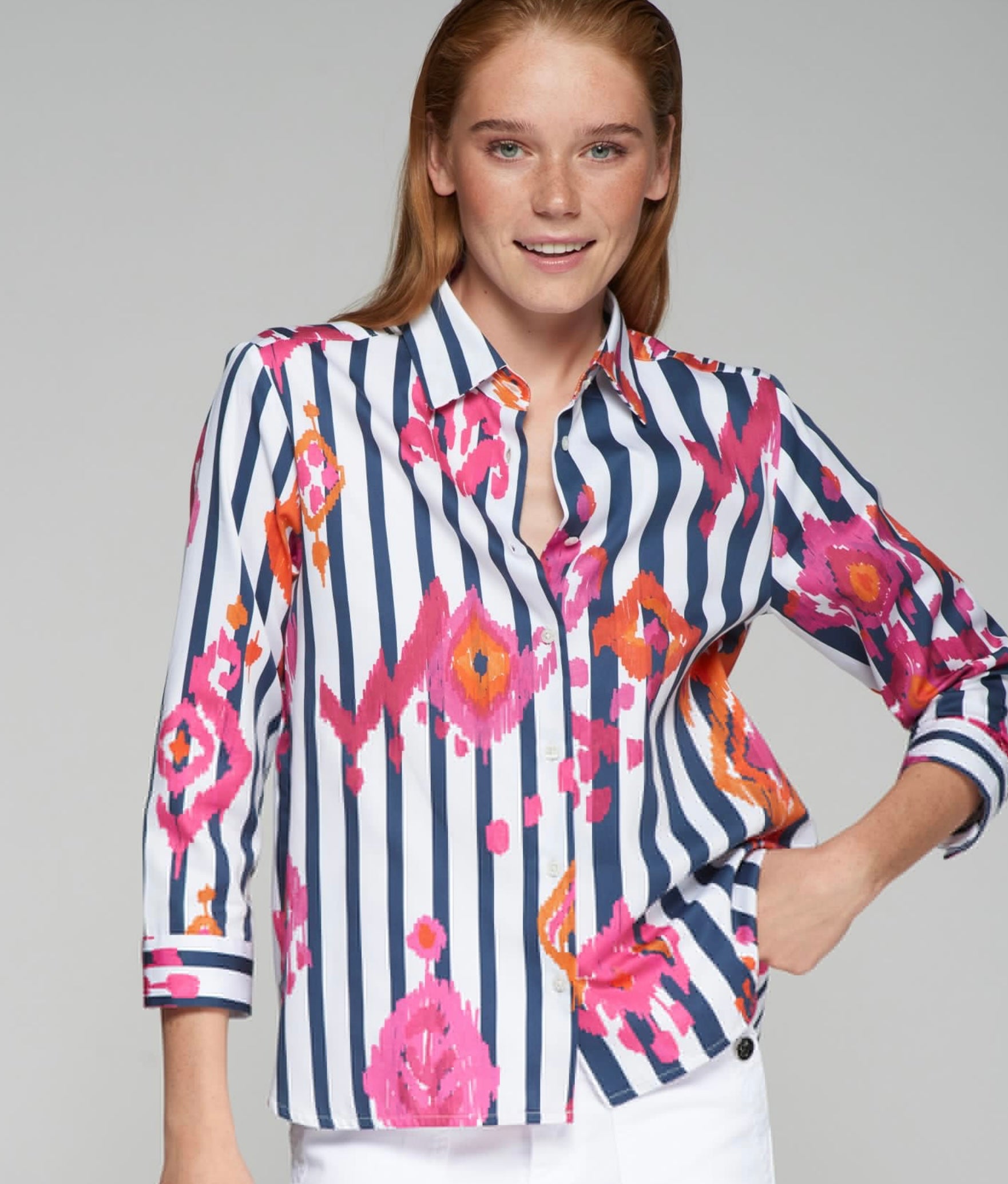 Navy blue and white striped shirt with ikat print in pink and orange. Front button fastening. Three-quarter sleeves with cuffs. 100% cotton. Matching skirt available. Model is 1.74 and wears size 38.
