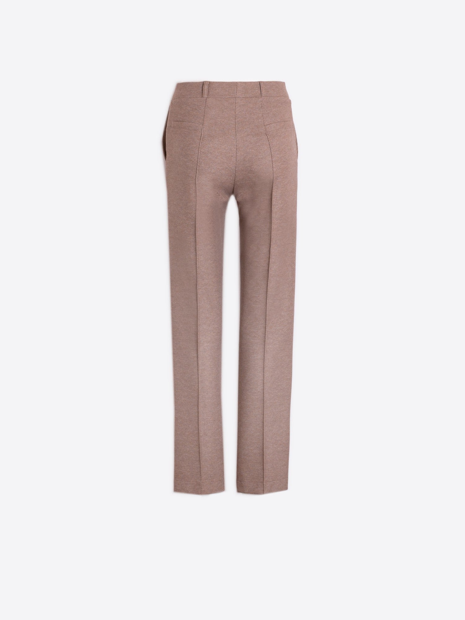 Beige straight trousers made of structured diagonal knit fabric. Mid-rise waist with visible belt loops and vertical seams on both front and back. Clean design with front pockets. Slight stretch for comfort. Designed to be worn with a matching jacket in the same fabric.