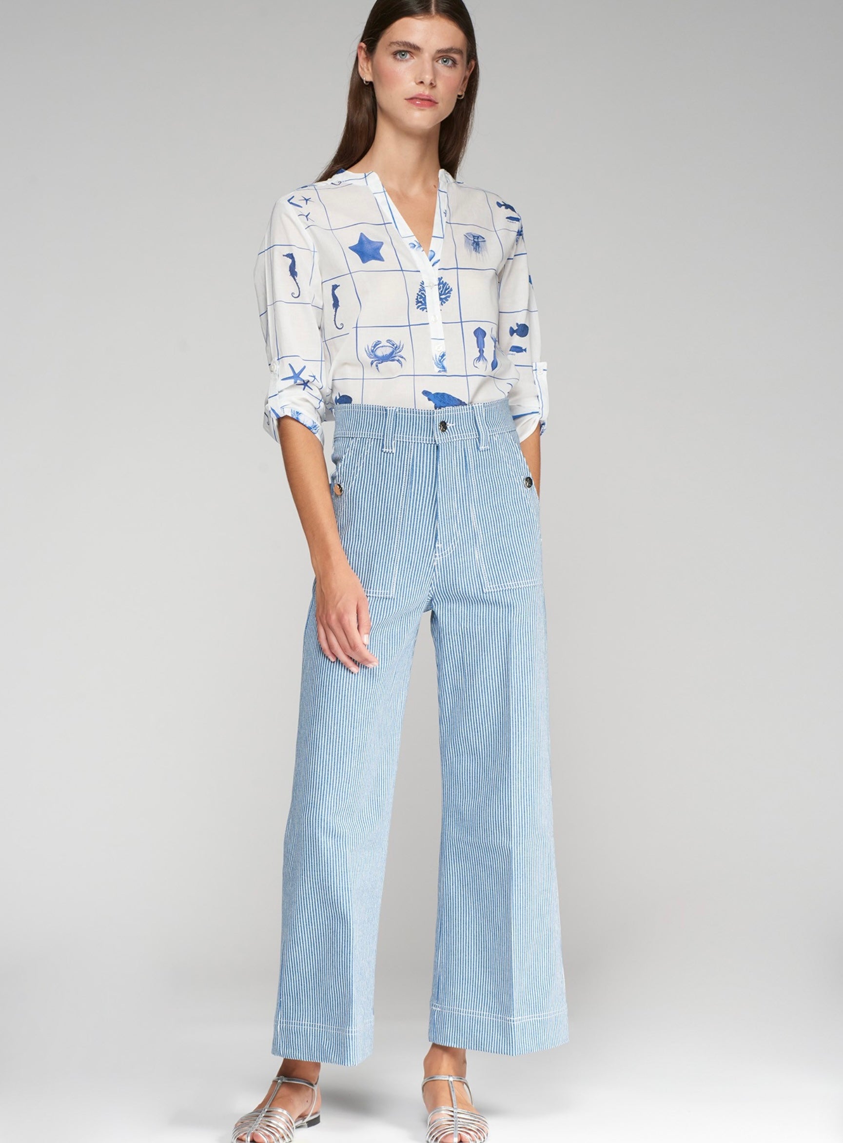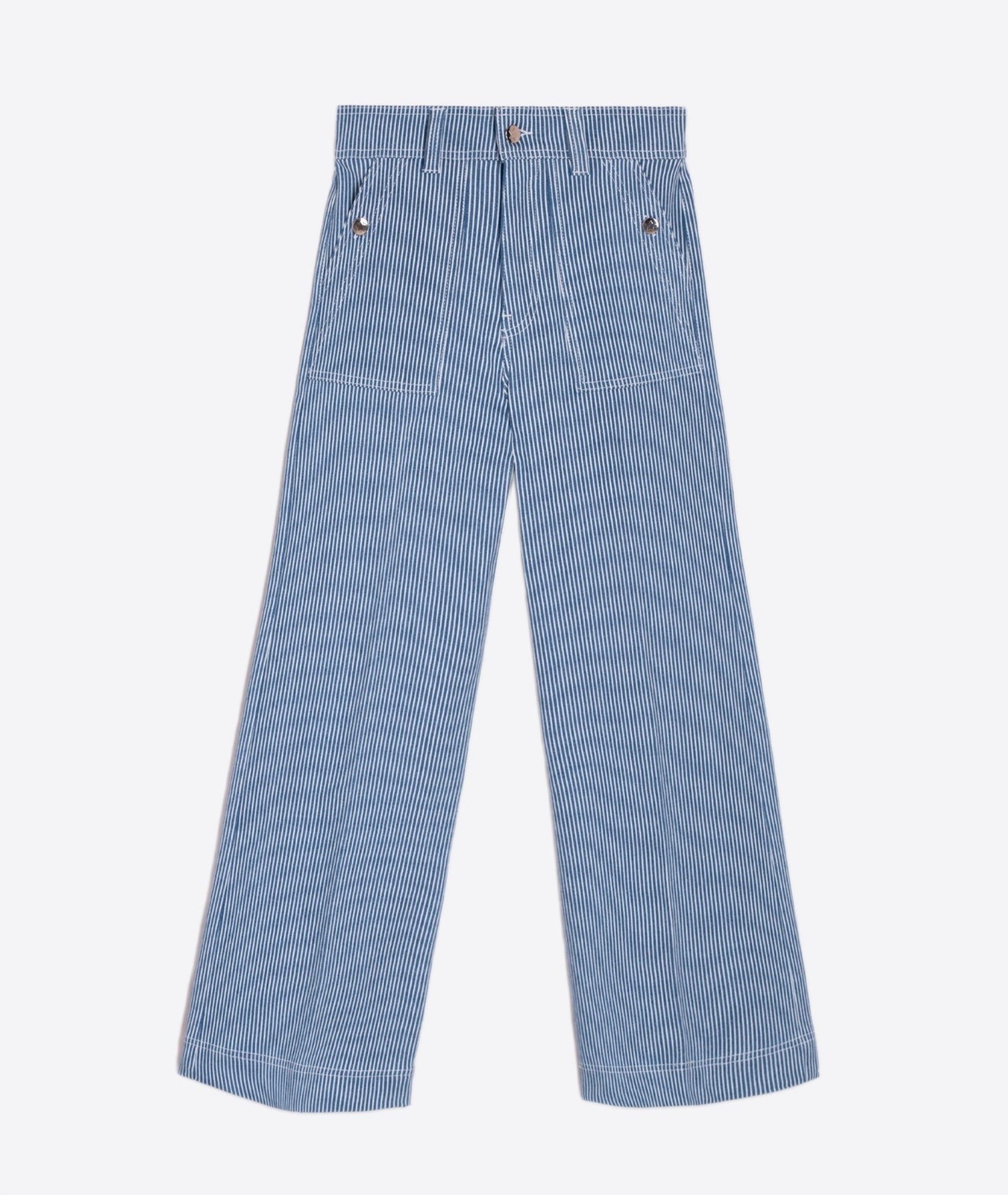 Blue and white striped denim pants. Front pockets with metal button. Sustainable finishing: when washing the denim we use an ozone generator to avoid using chemicals that are harmful to the environment. The model is 1.74 cm tall and wears size 38.