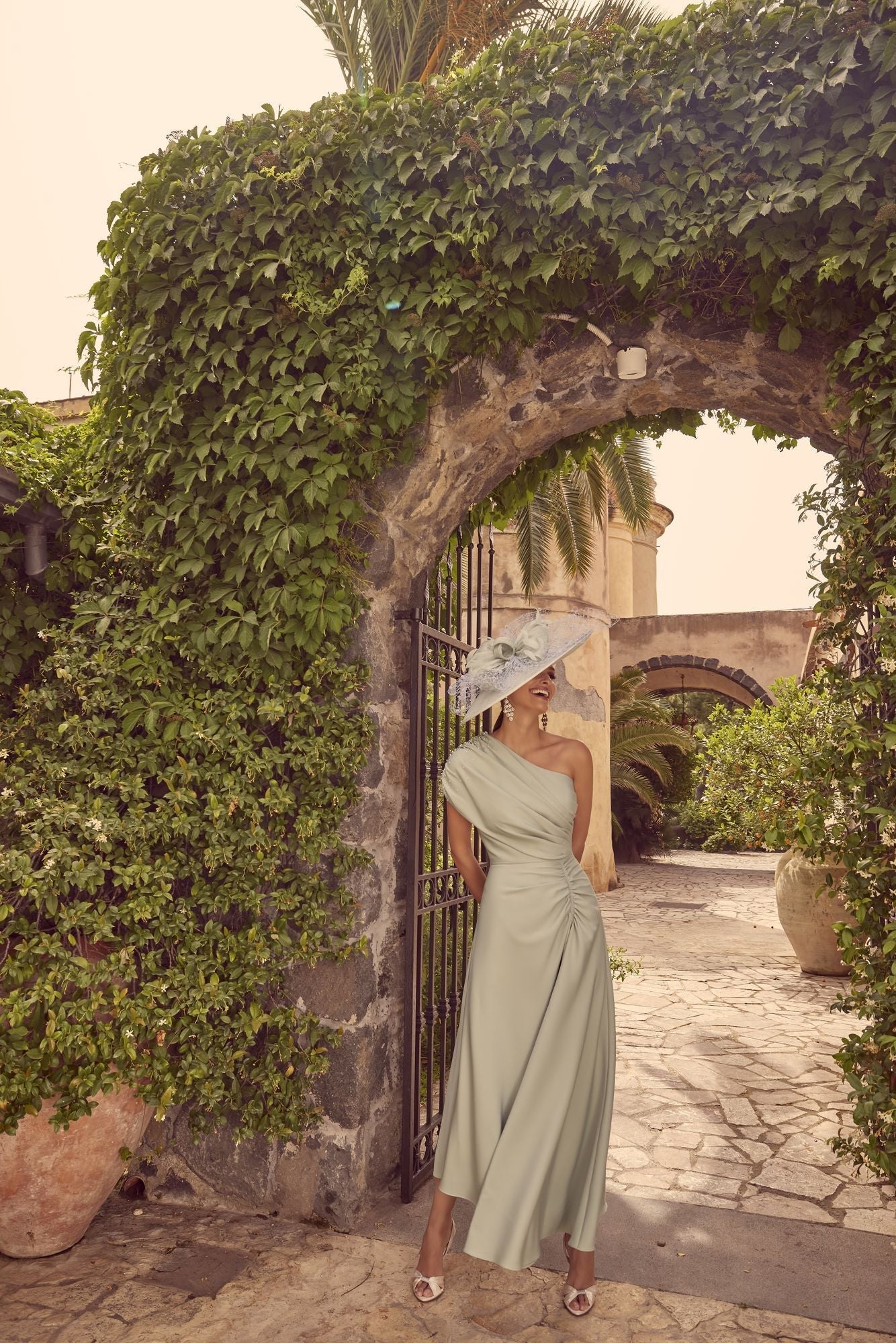 An asymmetrical beaded one-shoulder, A-line, crepe dress with a cinched waistband. Sage green.