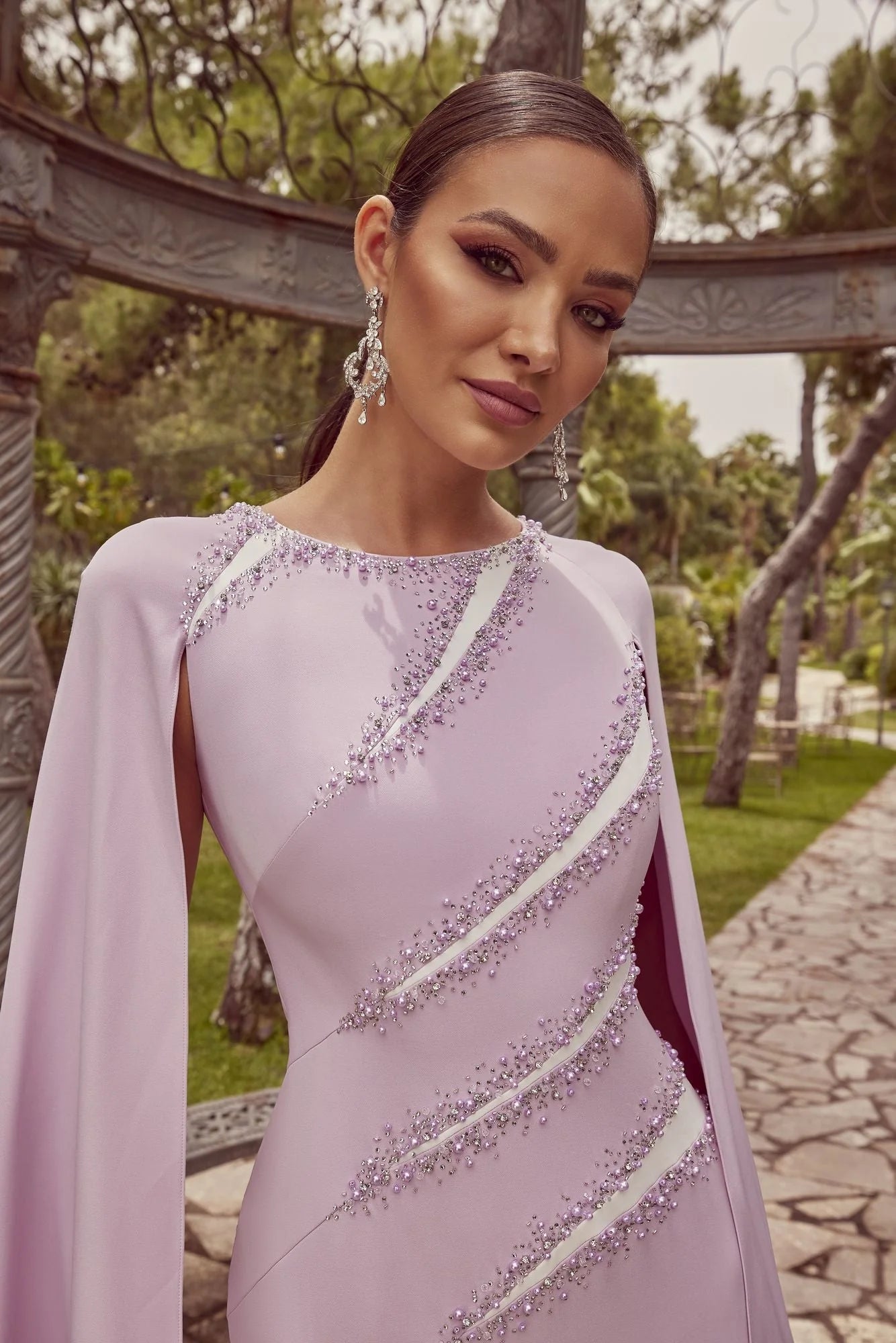 A modern fitted mid-length dress, featuring an asymmetrical beaded bodice and mid cape sleeves. Lavender pink. and Ivory.