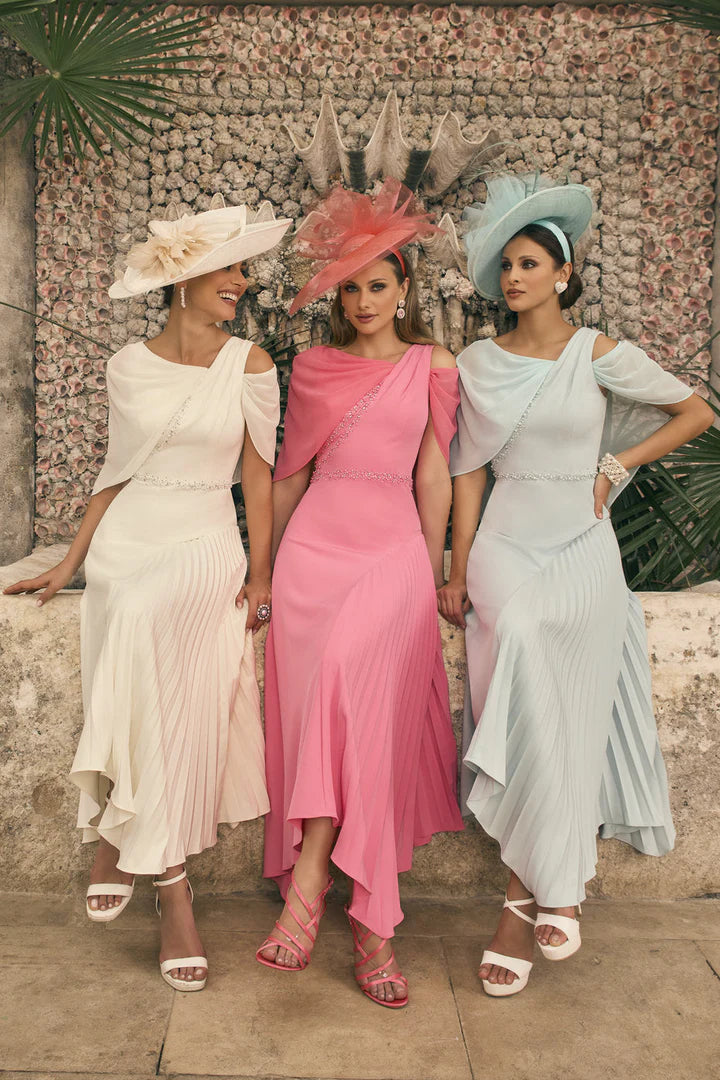 Chic and fashion-forward, this contemporary A-line dress features a pleated-to-straight skirt, dramatic drop cape sleeves, and a beautifully beaded bodice and waistband. The result is a striking, couture-inspired silhouette perfect for making a statement